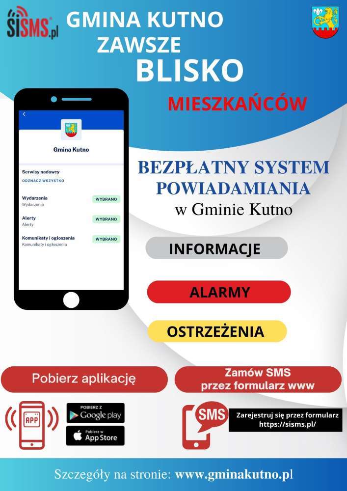 Gmina Kutno wprowadziła BEZPŁATNY SYSTEM powiadamiania mieszkańców. „Zachęcamy Państwa do rejestracji w systemie SISMS. Za jego pośrednictwem przekazujemy na bieżąco informacje o sprawach wpływających na komfort życia mieszkańców. System pozwala na komunikację poprzez SMS lub aplikację BLISKO” – komentuje Michał Łuczak, wójt gminy Kutno.