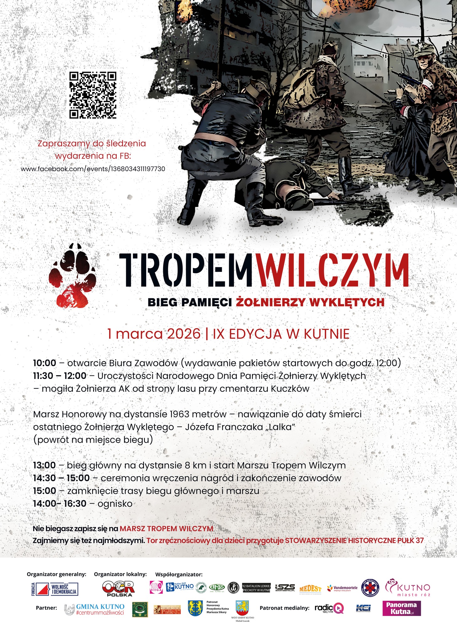 Zainteresowanie biegiem, jak co roku, jest duże i zostały już ostatnie wolne miejsca. Formularz zgłoszeniowy dostępny jest na stronie: https://foxter-sport.pl/bieg-pamieci-zolnierzy-wykletych-tropem-wilczym-w-kutnie-2026