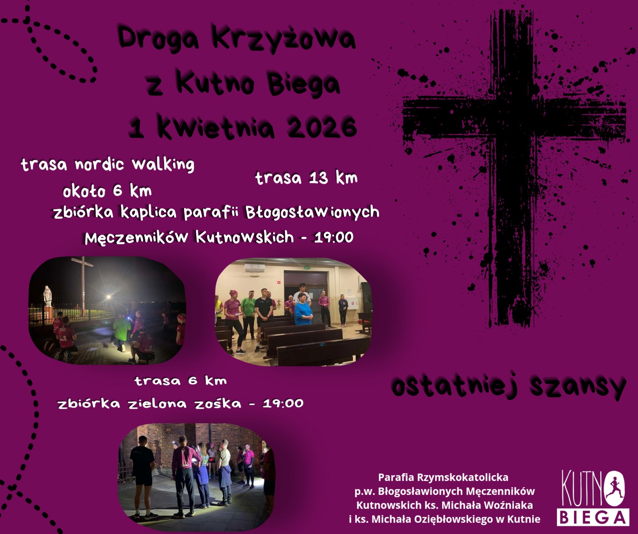Dziś, w środę 1 kwietnia, w Kutnie odbędzie się wyjątkowe wydarzenie łączące aktywność fizyczną z duchowym przeżyciem. Stowarzyszenie Kutno Biega zaprasza mieszkańców na biegową i nordic walking Drogę Krzyżową. Uczestnicy będą mogli wybrać jedną z trzech przygotowanych tras.