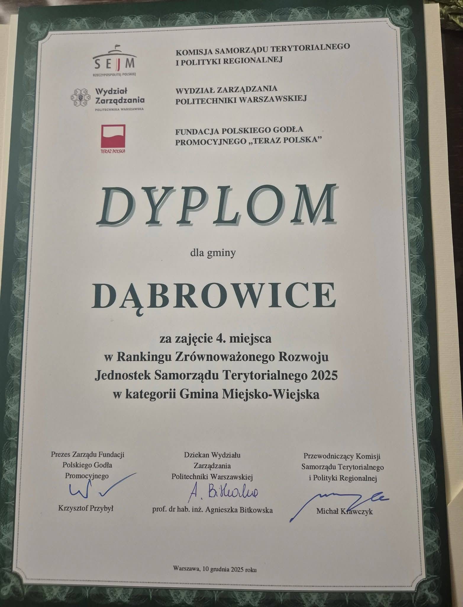 Burmistrz Miasta i Gminy Dąbrowice odebrała dyplom dla gminy Dąbrowice za zajęcie wysokiego, 4. miejsca w Polsce w Rankingu Zrównoważonego Rozwoju Jednostek Samorządu Terytorialnego 2025 w kategorii Gmina Miejsko-Wiejska.