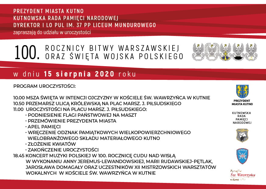 Prezydent Miasta Kutno, Kutnowska Rada Pamięci Narodowej oraz Dyrektor I LO PUL im. 37 PP Liceum Mundurowe zapraszają do udziału w uroczystości 100. rocznicy Bitwy Warszawskiej oraz Święta Wojska Polskiego w dniu 15 sierpnia 2020 roku.