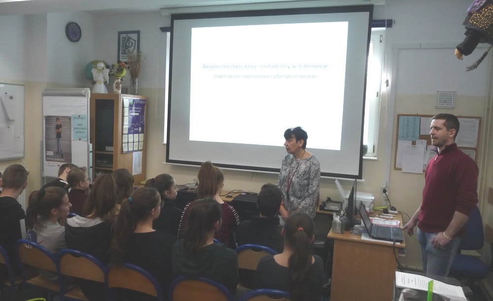 Zajęcia z uczniami klas IV-VIII zakończyły tegoroczny cykl szkolnych spotkań profilaktycznych nt. „Bezpieczeństwo dzieci i młodzieży w internecie – najnowsze zagrożenia cyberprzestrzeni”. Najpierw w październiku uczestniczyli w nich gimnazjaliści, w styczniu na spotkanie zaproszeni zostali rodzice uczniów.
