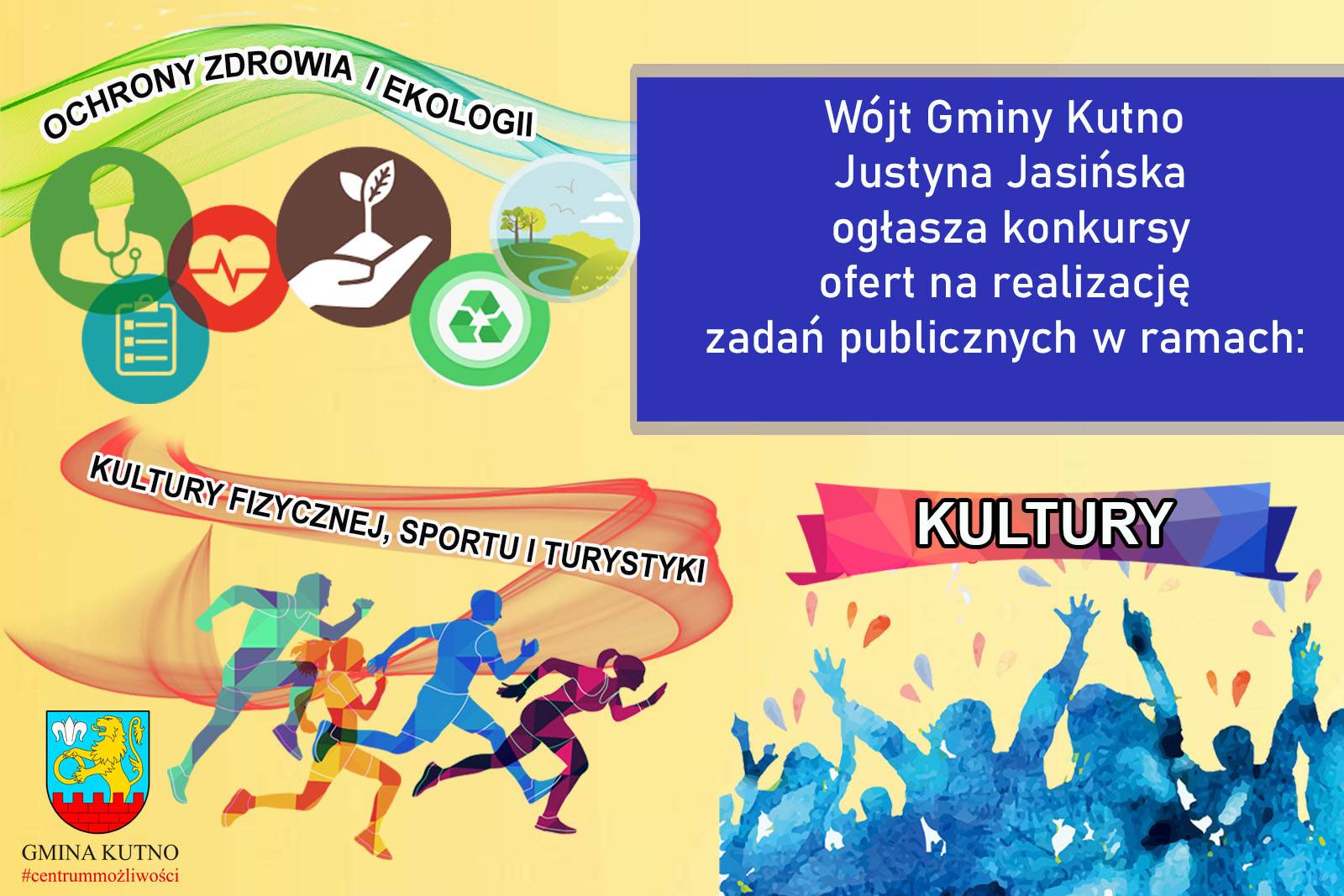 Wójt Gminy Kutno Justyna Jasińska zaprasza organizacje pozarządowe oraz podmioty wymienione w art. 3 ust. 3 ustawy o działalności pożytku publicznego i o wolontariacie do złożenia wniosku na realizację zadań publicznych Gminy Kutno w 2021 roku w zakresie: