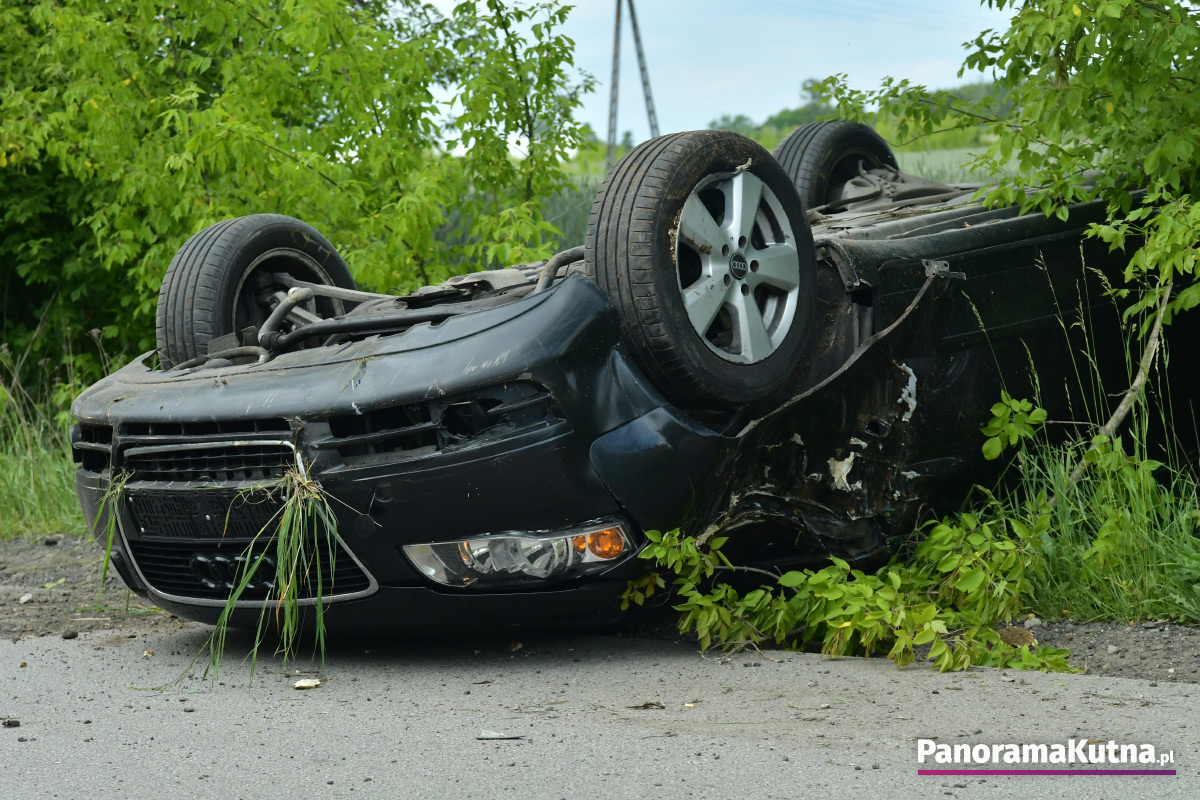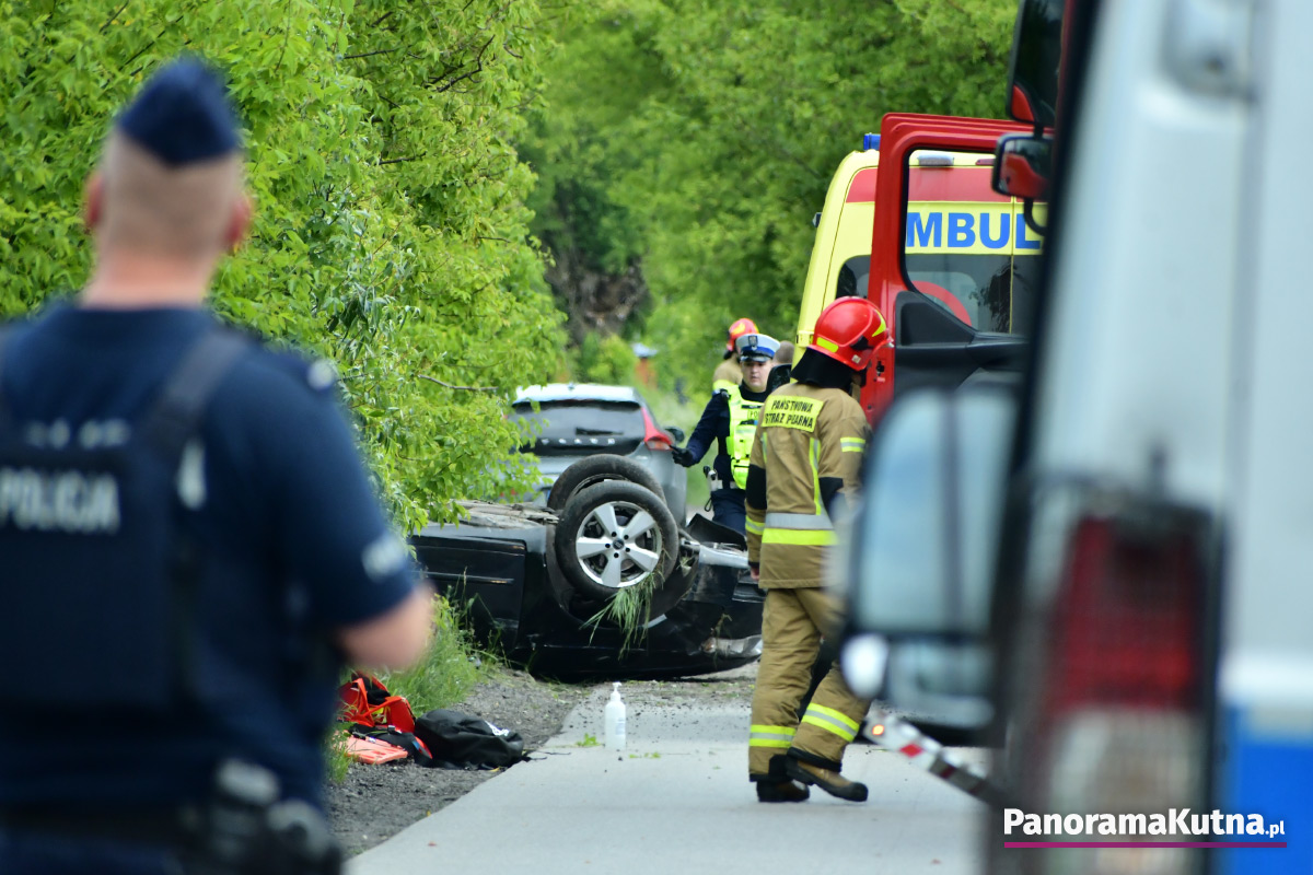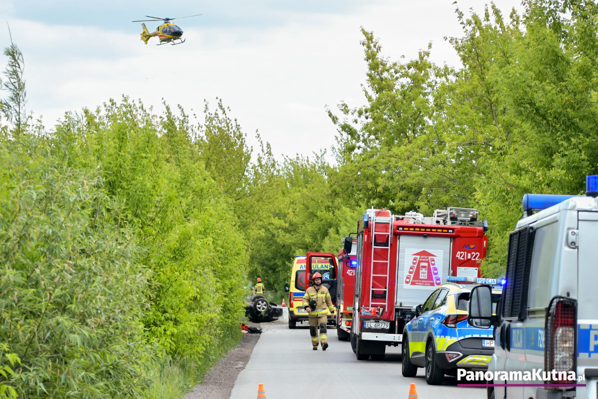 Zgłoszenie o zdarzeniu wpłynęło do kutnowskich służb około godziny 15:20. Ze wstępnych ustaleń wynika, że doszło do dachowania samochodu osobowego. W pobliżu miejsca zdarzenia znaleziono także nieprzytomnego rowerzystę. Na miejsce zadysponowano śmigłowiec Lotniczego Pogotowia Ratunkowego. Na razie nie są znane przyczyny wypadku. Trwa ustalanie okoliczności zdarzenia.