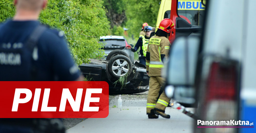 Zgłoszenie o zdarzeniu wpłynęło do kutnowskich służb około godziny 15:20. Ze wstępnych ustaleń wynika, że doszło do dachowania samochodu osobowego. W pobliżu miejsca zdarzenia znaleziono także nieprzytomnego rowerzystę. Na miejsce zadysponowano śmigłowiec Lotniczego Pogotowia Ratunkowego. Na razie nie są znane przyczyny wypadku. Trwa ustalanie okoliczności zdarzenia.