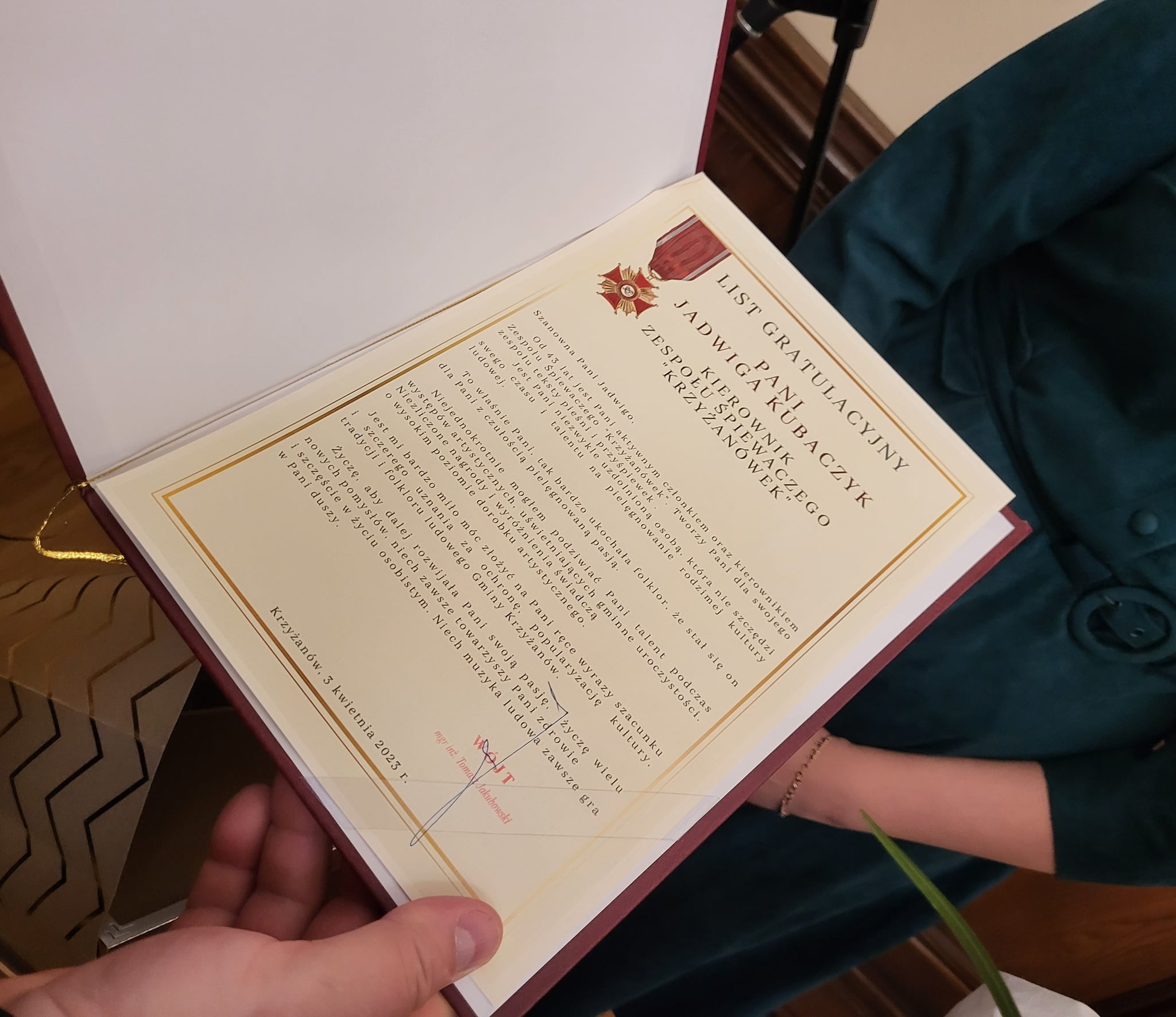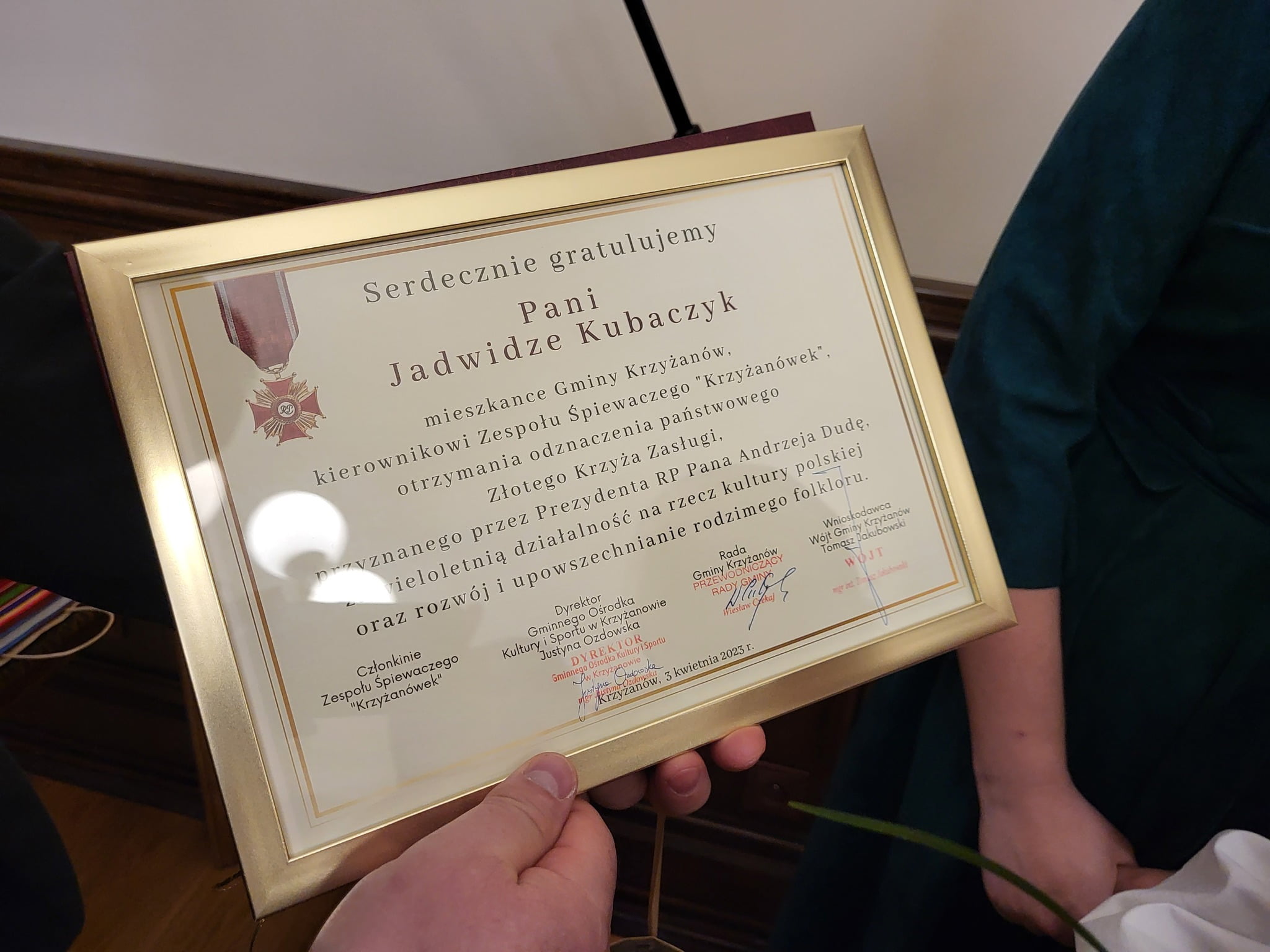 W poniedziałek 3 kwietnia 2023 przed południem w Łódzkim Urzędzie Wojewódzkim, podczas uroczystego spotkania, Wojewoda Łódzki Tobiasz Bocheński, na wniosek Wójta Gminy Krzyżanów Tomasza Jakubowskiego, wręczył Pani Jadwidze Złoty Krzyż Zasługi, nadany przez Prezydenta Rzeczpospolitej Andrzeja Dudę, za wybitne zasługi na rzecz rozwoju i promocji kultury ludowej.