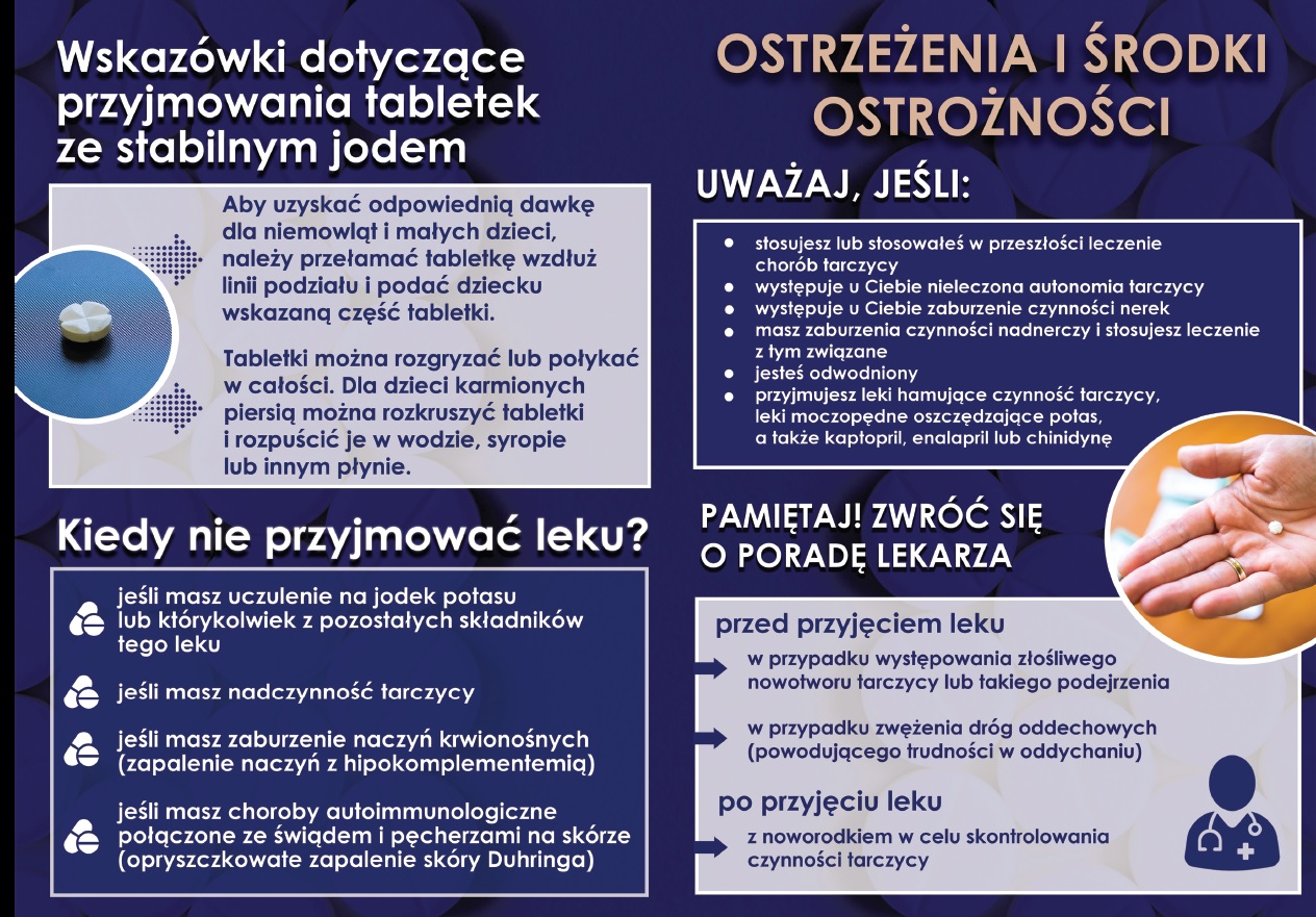 Według zaleceń Ministerstwa Zdrowia za optymalny okres podawania tabletek jodku potasu należy uznać czas krótszy niż 24 godziny przed przewidywanym początkiem ekspozycji na napromienienie oraz do 2 godzin po jej rozpoczęciu, jednakże podanie tabletek jodku potasu do 8 godzin od początku ekspozycji przynosi także efekty korzystne.