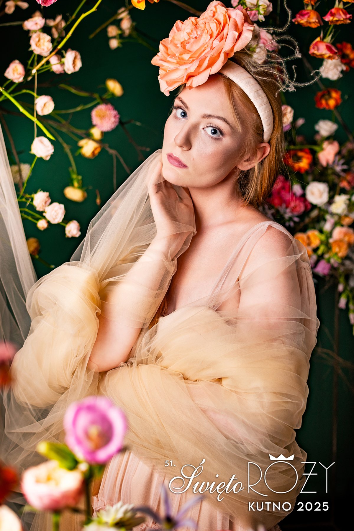 Modelka, tegoroczna Królowa Róż, wniosła do sesji coś więcej niż tylko urodę. Choć jej niebieskie oczy, jasna cera i spokojne spojrzenie same w sobie przyciągają uwagę, to przede wszystkim jej wdzięk, delikatność gestów i umiejętność „zanurzenia się” w florystyczną kompozycję nadały zdjęciom magii. Naturalne piękno Martyny podkreśliła Izabela Dłużniewska, Isabel Makijaż.