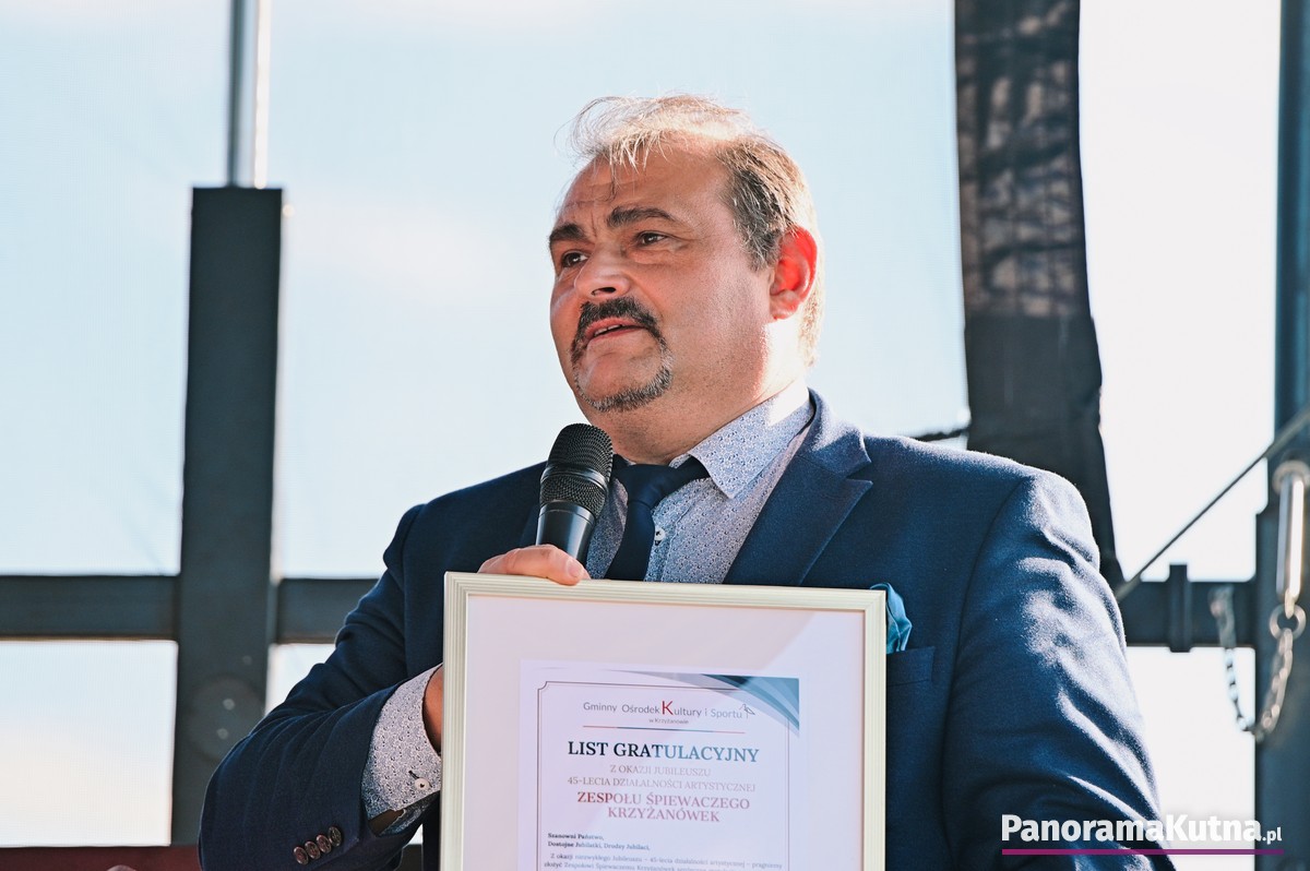 Dla posła Tadeusza Woźniaka był to wyjątkowy moment. Na scenie pojawił się wraz z małżonką, a jego związki z zespołem są bardzo osobiste, bo w Zespole Krzyżanówek śpiewa jego córka i wnuczka. Nie brakowało upominków i kwiatów. Gratulacje złożył również między innymi nowy dyrektor Gminnego Ośrodka Kultury i Sportu w Krzyżanowie, Grzegorz Dębski.