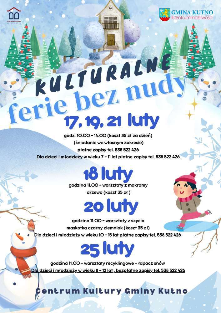 Ferie zimowe to idealny czas na rozwijanie pasji, aktywny wypoczynek i świetną zabawę. Centrum Kultury Gminy Kutno w Leszczynku zaprasza dzieci i młodzież na wyjątkowe „Kulturalne ferie bez nudy”! W bogatym programie każdy znajdzie coś dla siebie.