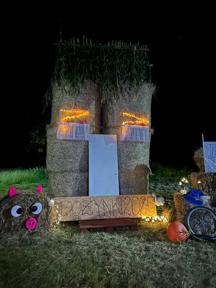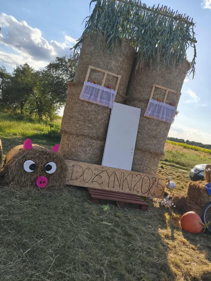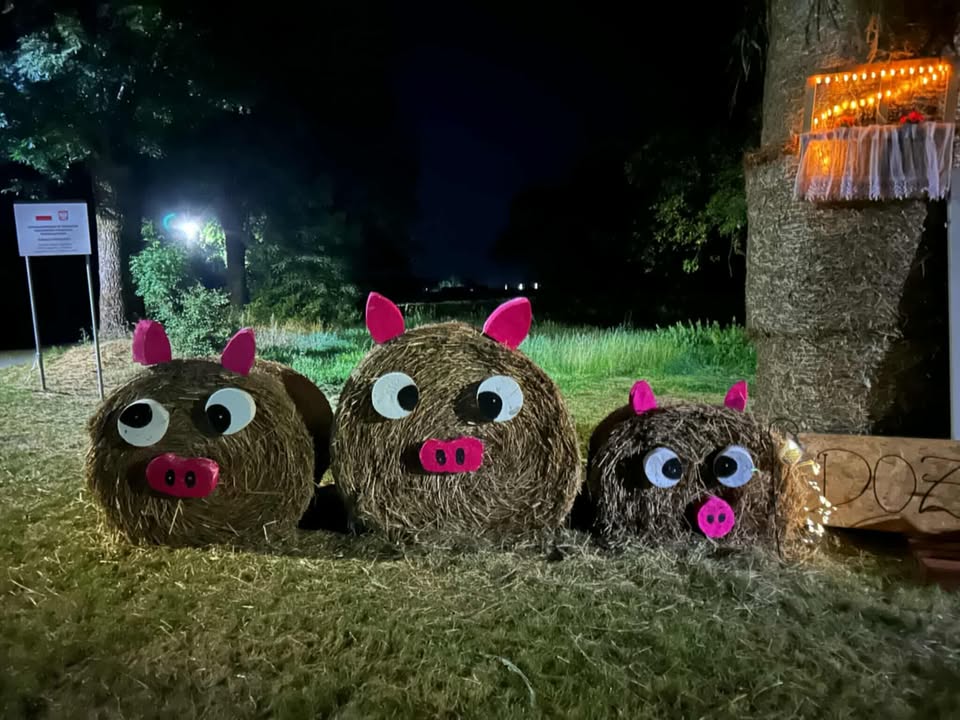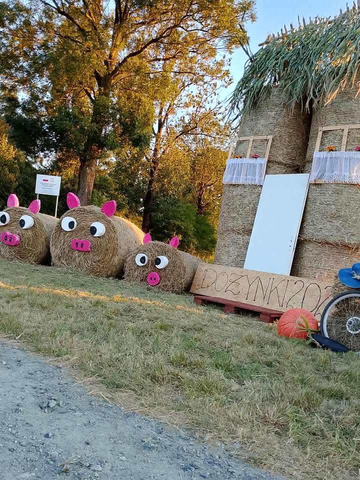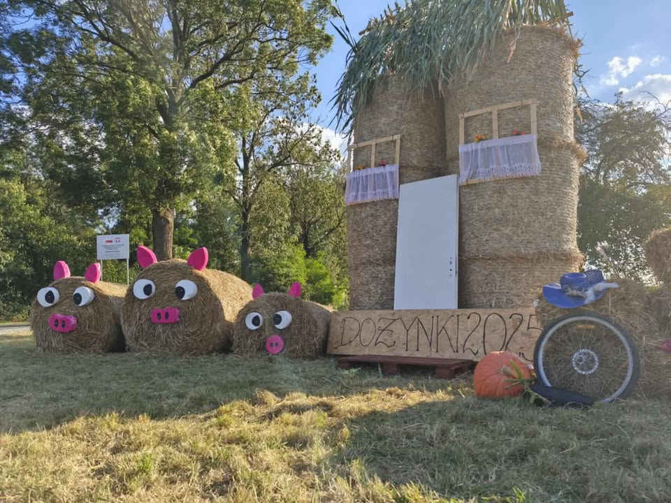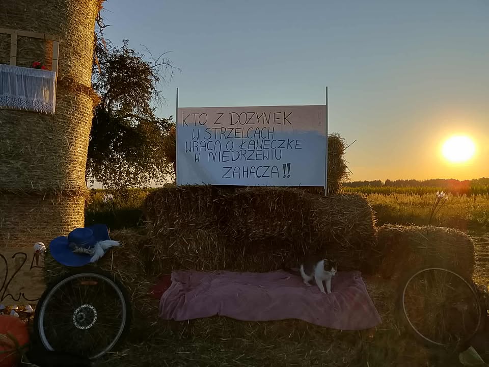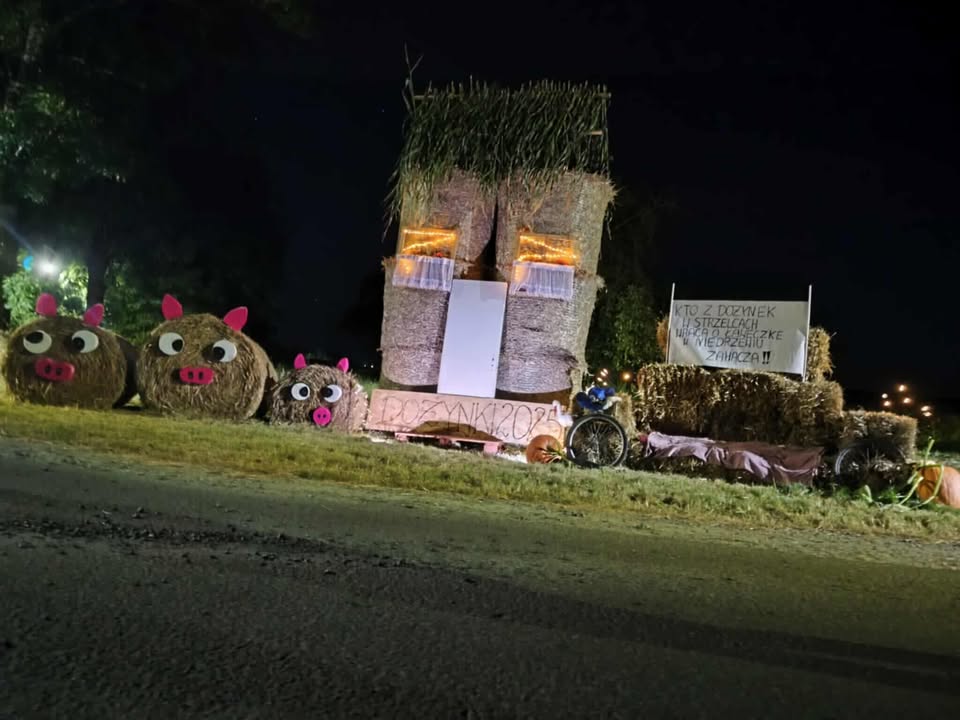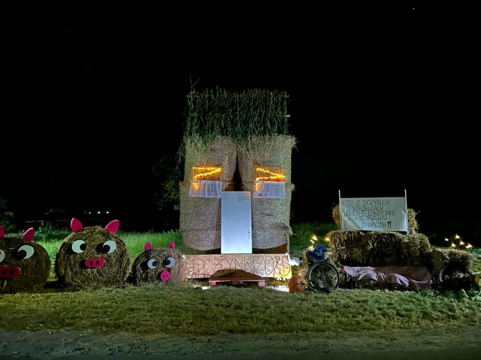 W Niedrzewiu pojawiły się radosne figury dożynkowe, a wśród nich nie brakuje nawet… świnek ulepionych z bel słomy. Każda dekoracja powstała z pomysłowości mieszkańców, którzy co roku starają się, by witacze były jeszcze bardziej oryginalne. Szczególną uwagę przyciąga hasło na jednej z instalacji: „Kto z dożynek w Strzelcach wraca, o ławeczkę w Niedrzewiu zahacza!”. To żartobliwe zaproszenie, które doskonale oddaje atmosferę wspólnego świętowania i gościnności mieszkańców sołectwa.