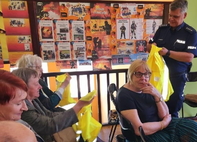 Na zakończenie spotkania dzielnicowy chętnie odpowiadał na pytania starszych osób. Każdy z uczestników spotkania otrzymał również kamizelkę odblaskową.