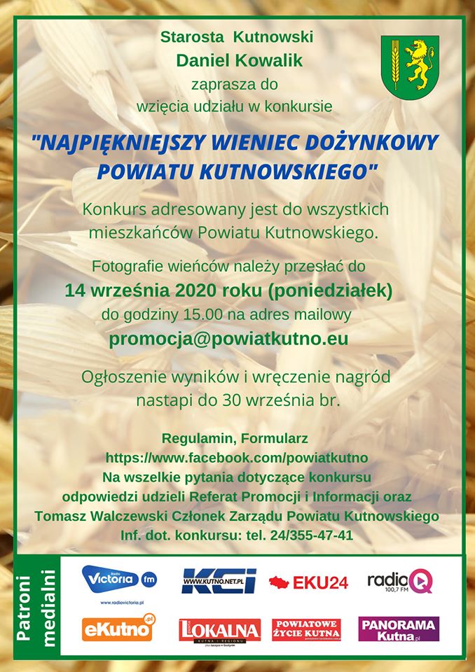 Starosta Kutnowski Daniel Kowalik zaprasza do wzięcia udziału w konkursie „Najpiękniejszy wieniec dożynkowy Powiatu Kutnowskiego”. Patronem medialnym wydarzenia jest Panorama Kutna.