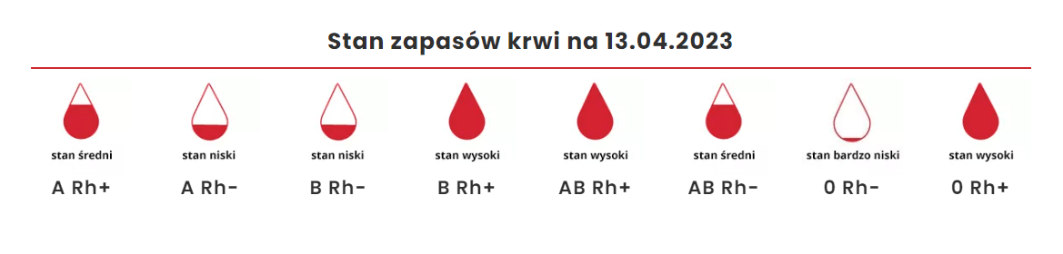 Na dzień 13 kwietnia 2023 RCKiK podaje, że niski stan zapasów dotyczy grup A Rh-, B Rh- oraz 0 Rh-.
