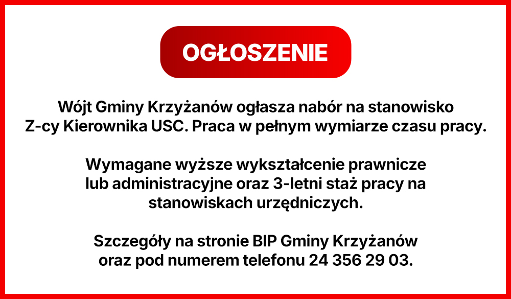 Wójt Gminy Krzyżanów ogłasza nabór na stanowisko Z-cy Kierownika USC. Praca w pełnym wymiarze czasu pracy. Wymagane wyższe wykształcenie prawnicze lub administracyjne oraz 3-letni staż pracy na stanowiskach urzędniczych. Szczegóły na stronie BIP Gminy Krzyżanów oraz pod numerem telefonu 24 356 29 03.