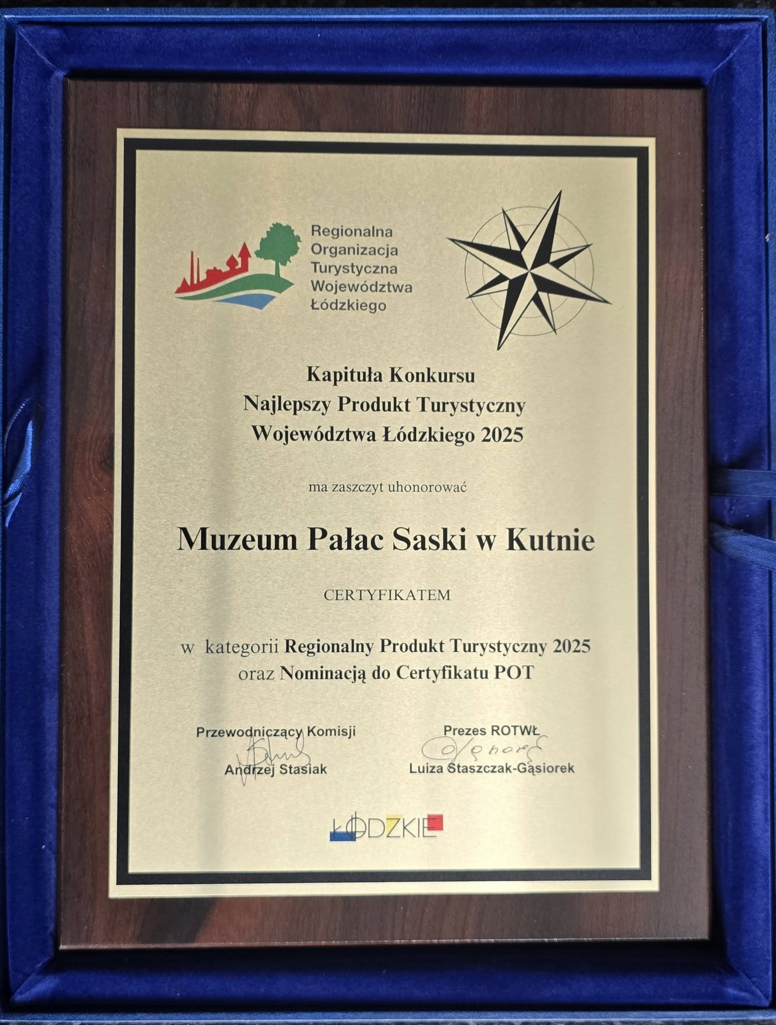 Muzeum Pałac Saski w Kutnie z kolejnym wyróżnieniem! Regionalna Organizacja Turystyczna Województwa Łódzkiego przyznała kutnowskiej instytucji certyfikat w kategorii Regionalny Produkt Turystyczny 2025 oraz nominację do Certyfikatu POT.