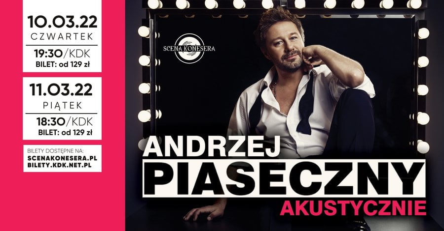 Andrzej Piaseczny - AKUSTYCZNIE! Przed Państwem projekt, ze wszech miar szczególny. Po raz pierwszy, będzie możliwość posłuchania utworów Artysty, w specjalnych, kameralnych warunkach, w wyjątkowych aranżacjach. Kutnowski Dom Kultury zaprasza!
