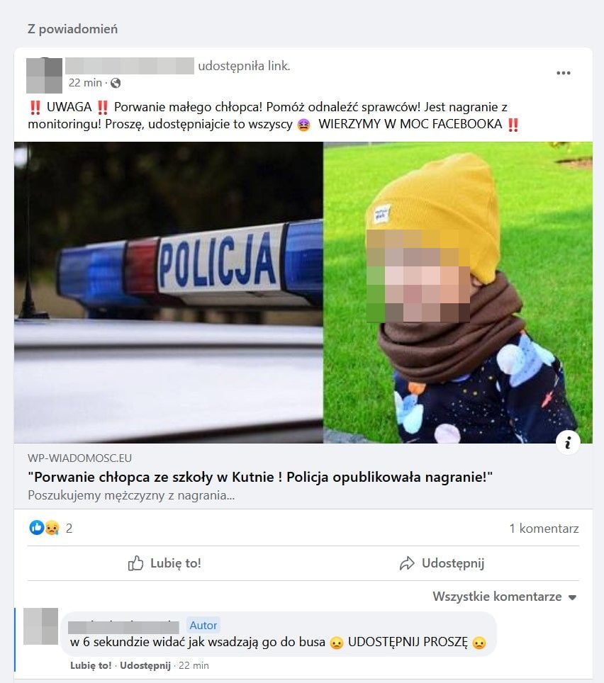 „Uwaga! Porwanie małego chłopca! Pomóż odnaleźć sprawców! Jest nagranie z monitoringu! Prosżę, udostępniajcie to wszyscy. WIERZYMY W MOC FACEBOOKA” – post o tej treści pojawił się dziś w mediach społecznościowych w kutnowskich grupach.