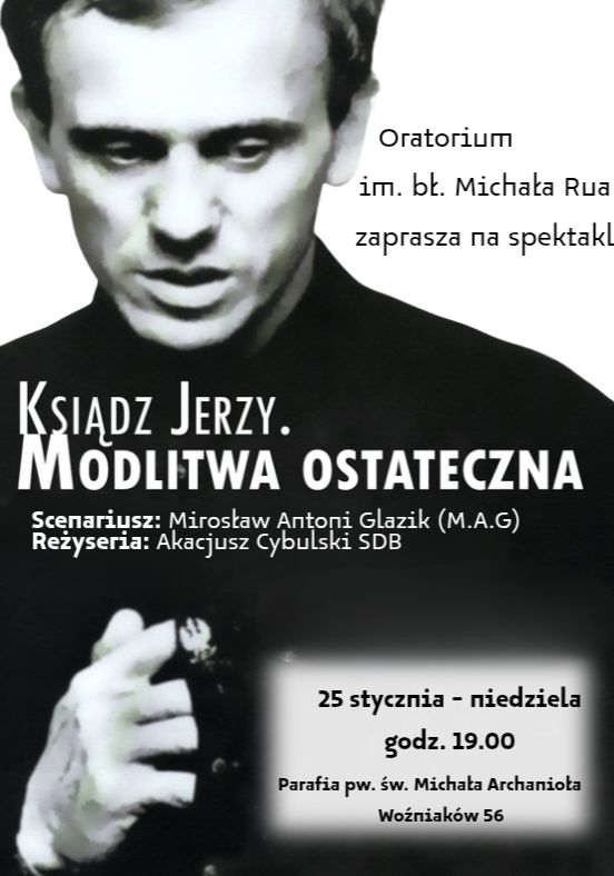 Oratorium Bł. Michała Rua zaprasza na spektakl teatralny „Ksiądz Jerzy. Modlitwa ostateczna”, przybliżający postać bł. księdza Jerzego Popiełuszki. Spektakl odbędzie się 25 stycznia o godz. 19.00 w parafii św. Michała Archanioła w Woźniakowie.