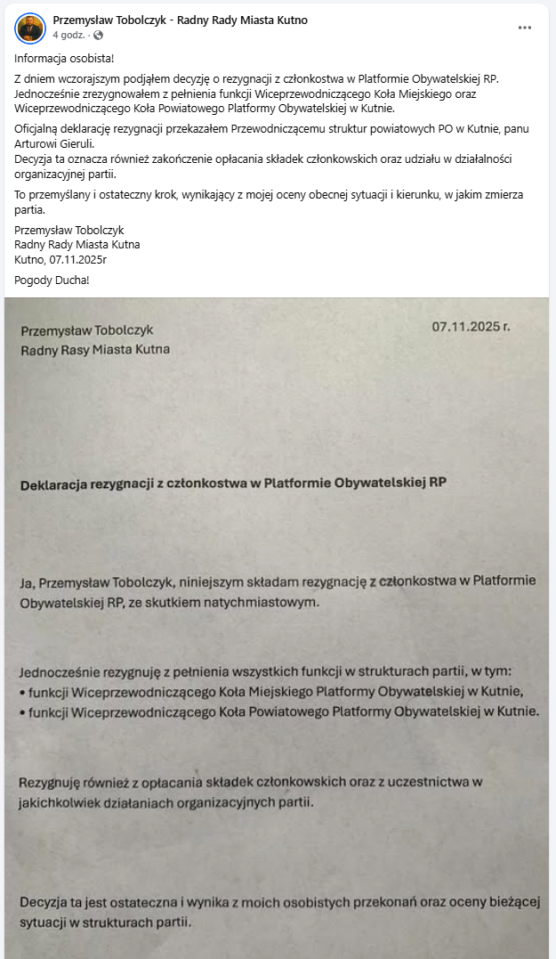 I dodaje:— Oficjalną deklarację rezygnacji przekazałem Przewodniczącemu struktur powiatowych PO w Kutnie, panu Arturowi Gieruli. Decyzja ta oznacza również zakończenie opłacania składek członkowskich oraz udziału w działalności organizacyjnej partii. To przemyślany i ostateczny krok, wynikający z mojej oceny obecnej sytuacji i kierunku, w jakim zmierza partia.