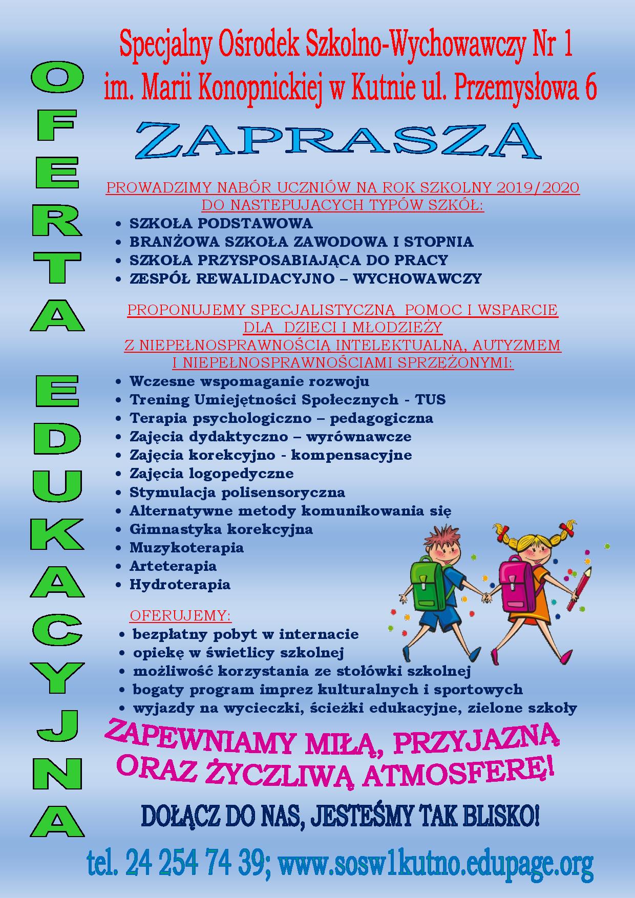 Specjalny Ośrodek Szkolno-Wychowawczy nr 1 im. Marii Konopnickiej w Kutnie przy ul. Przemysłowej prowadzi nabór uczniów na rok szkolny 2019/2020.