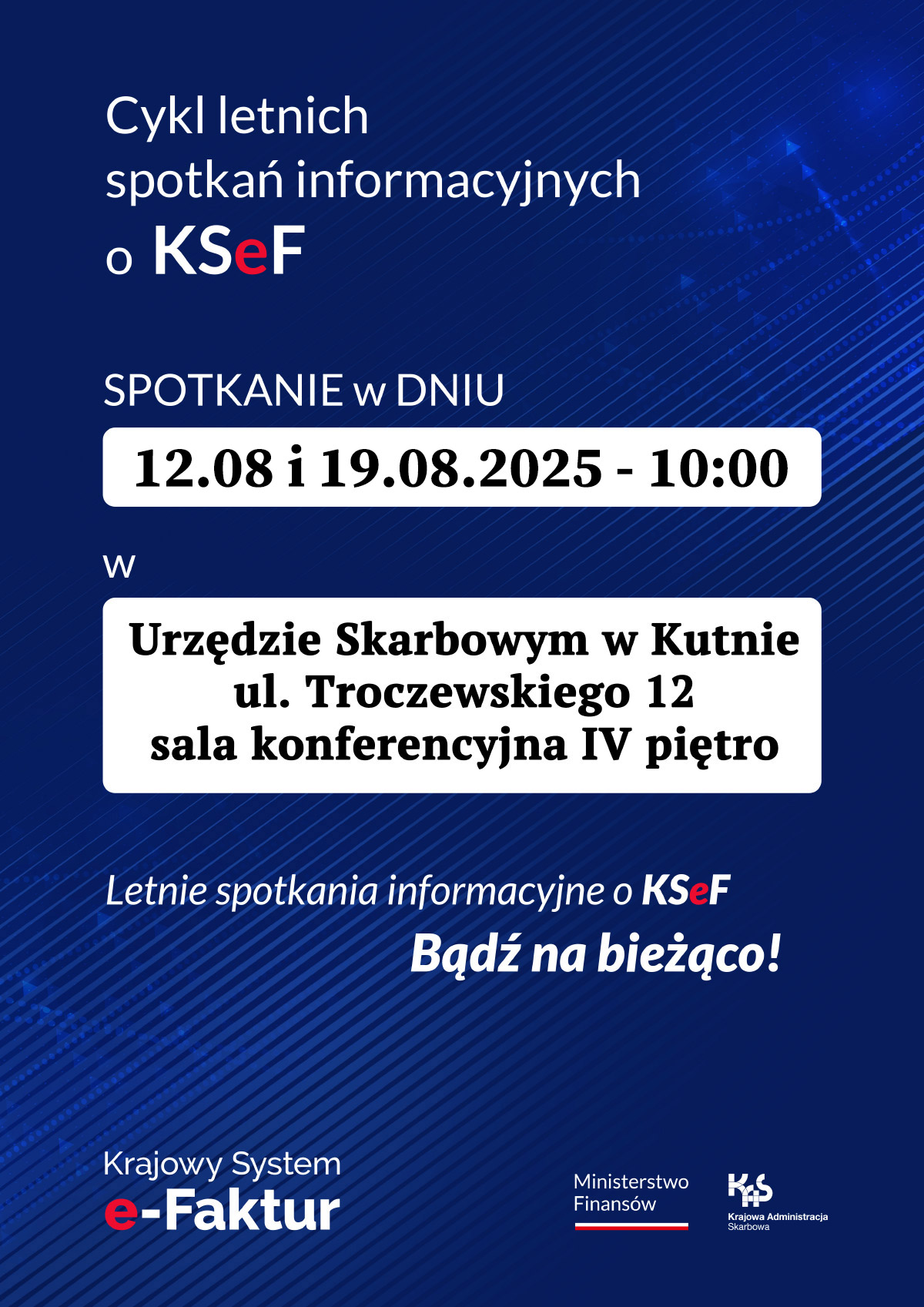 W ramach cyklu letnich spotkań informacyjnych dotyczących Krajowego Systemu e-Faktur (KSeF), 12 i 19 sierpnia 2025 roku o 10:00 w Urzędzie Skarbowym w Kutnie odbędzie się kolejne spotkanie. Wydarzenie zaplanowano w sali konferencyjnej na IV piętrze budynku przy ul. Troczewskiego 12.
