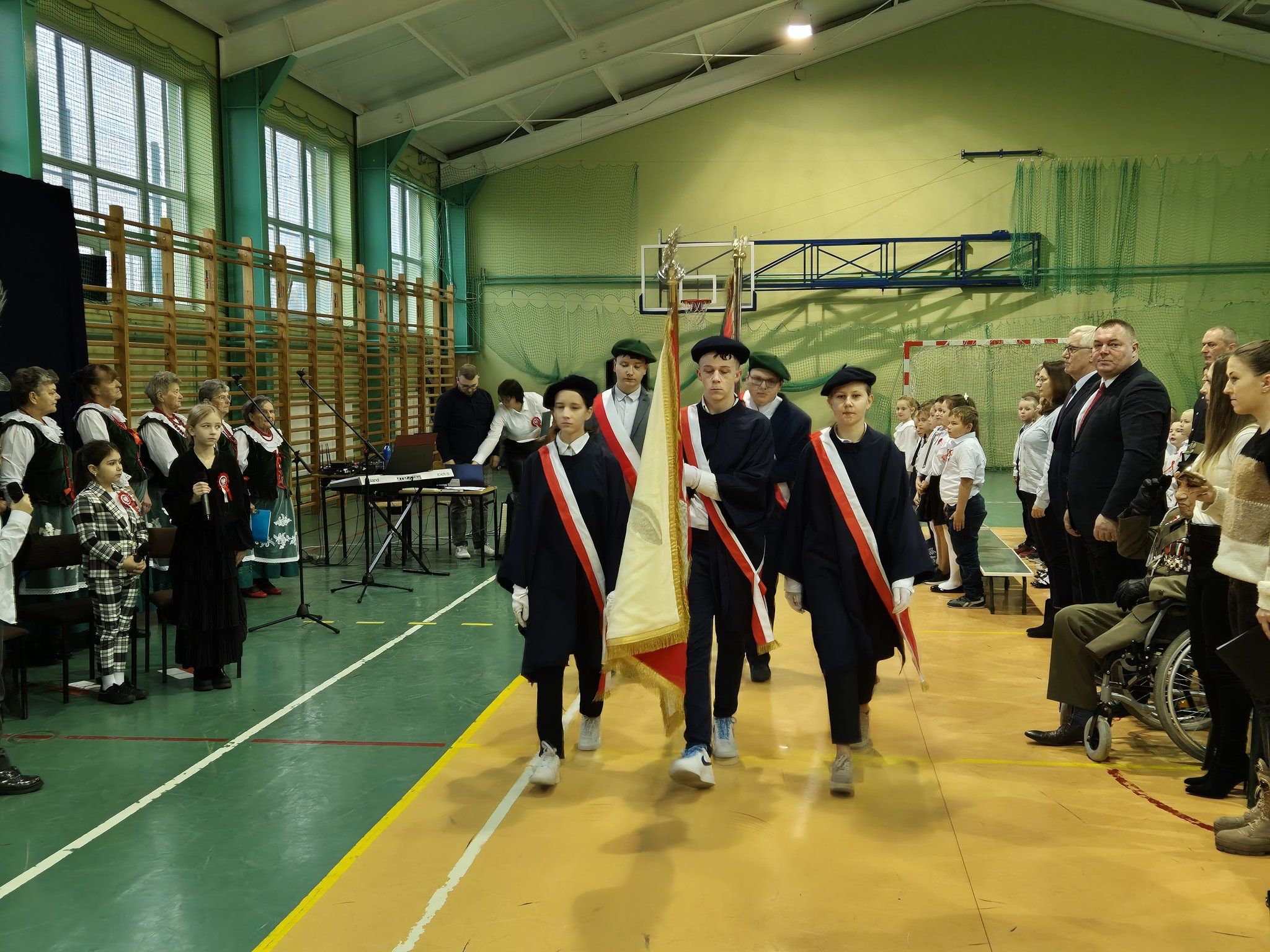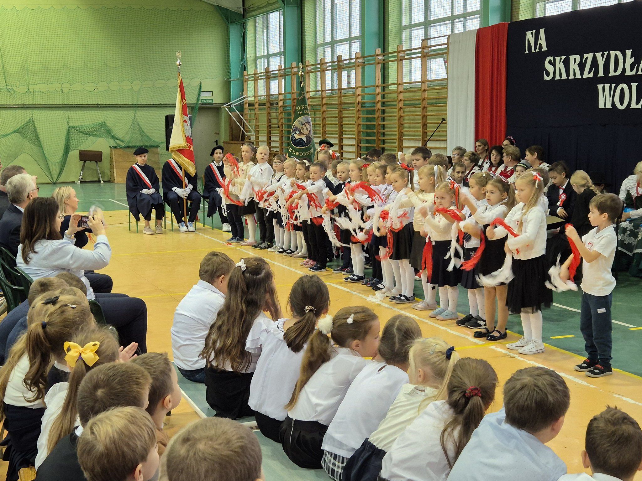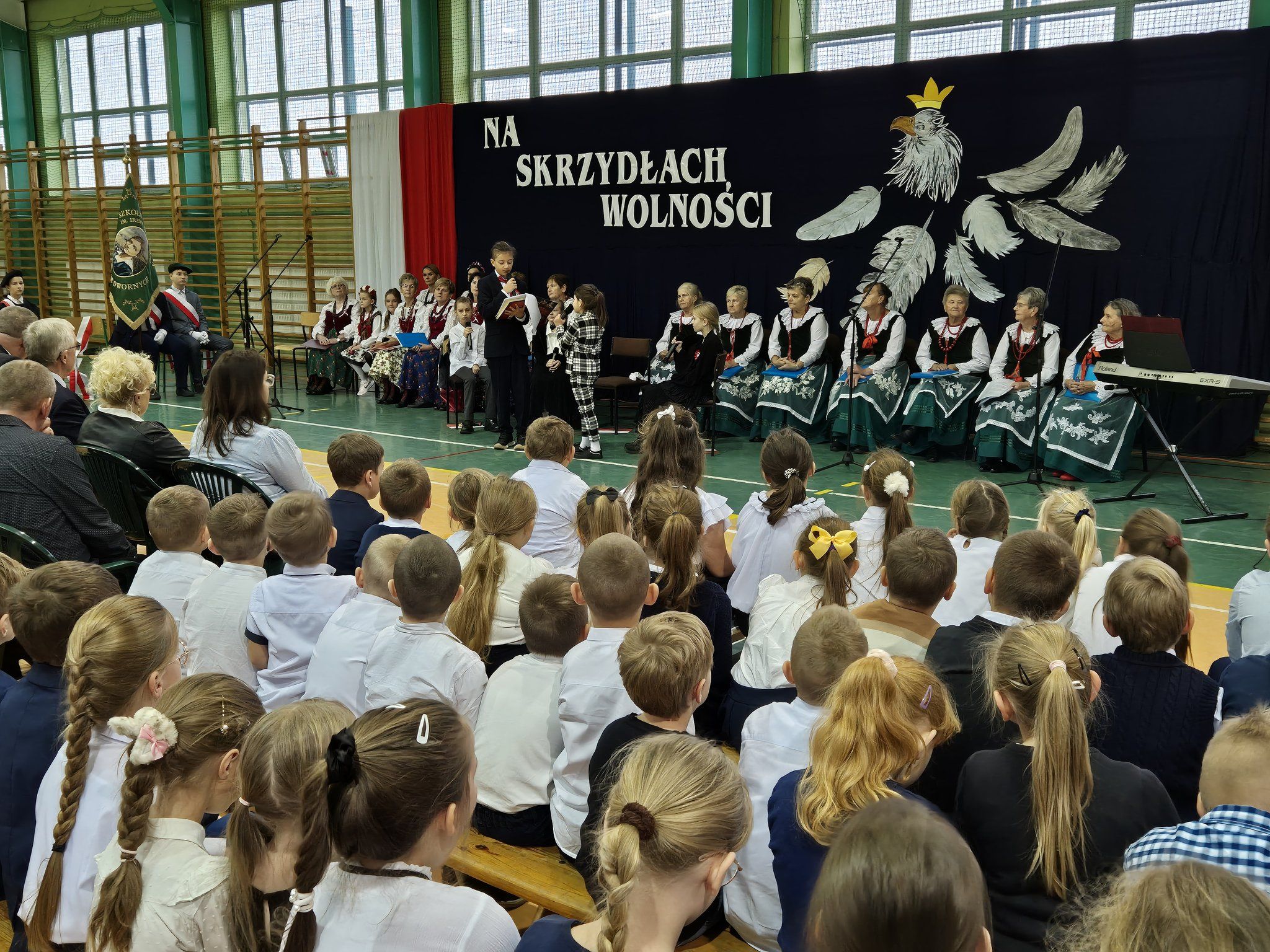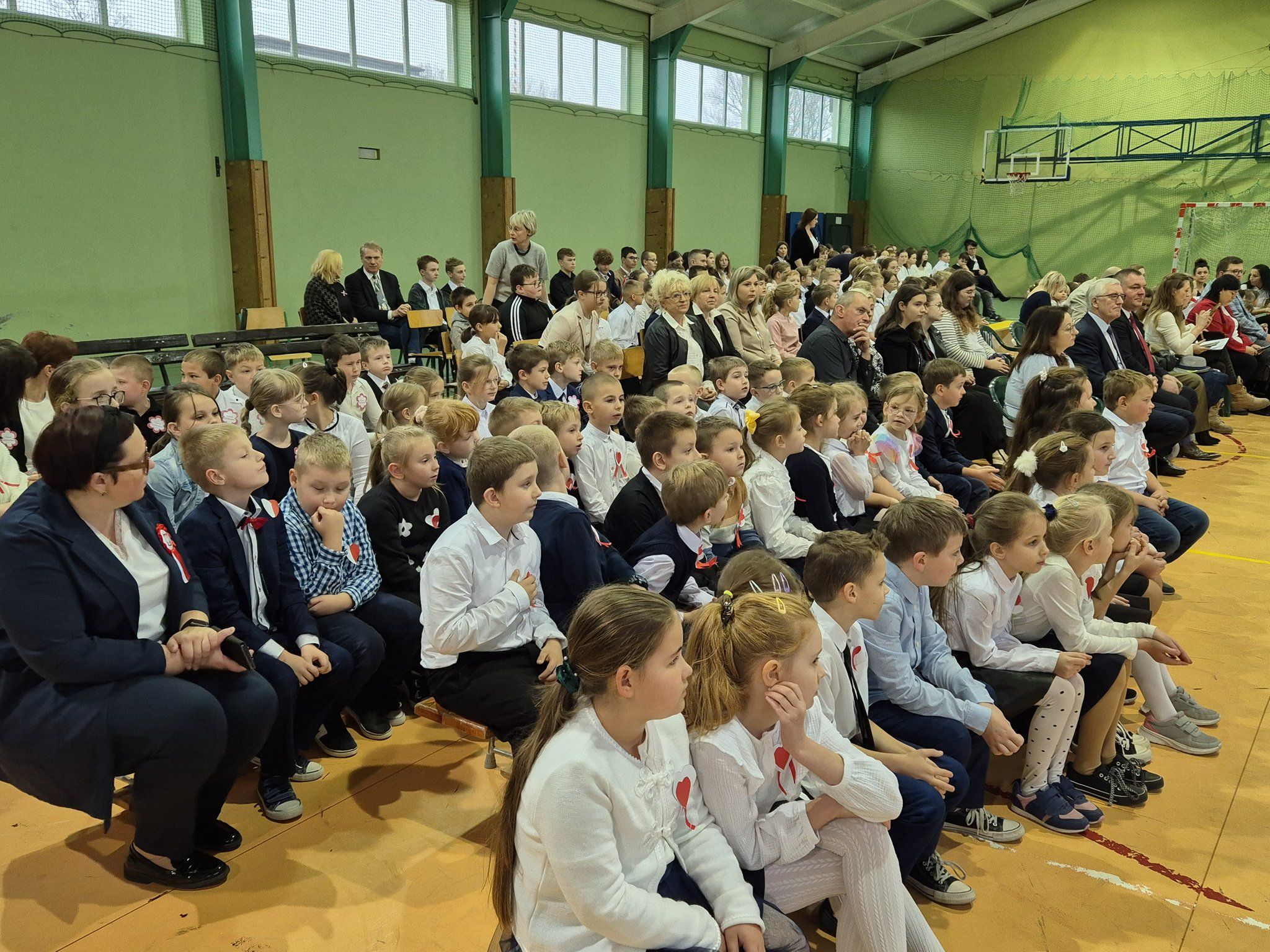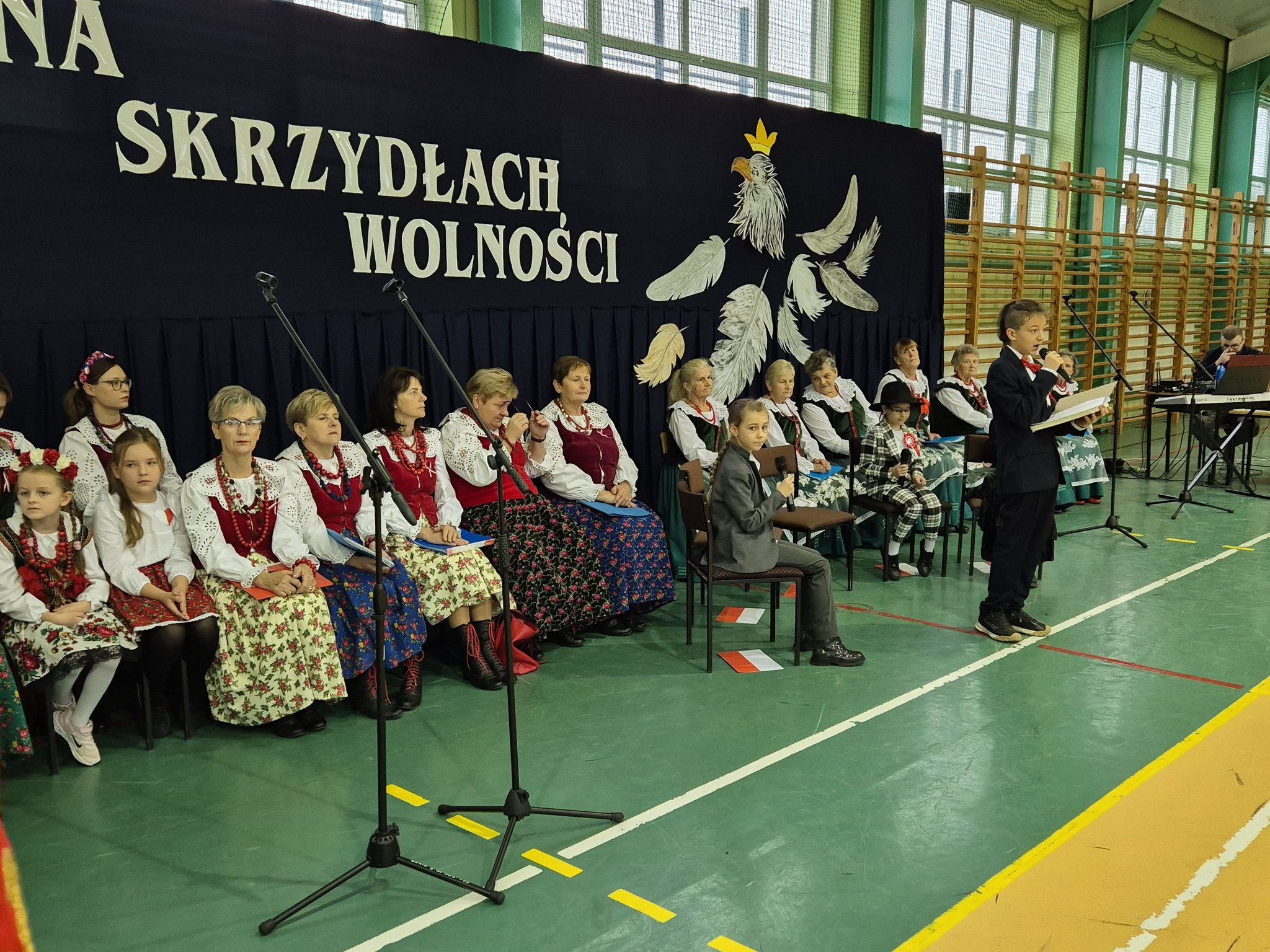 W pięknie udekorowanej, przez nauczycielkę Halinę Jabłońską, hali sportowej szkoły, uczestniczyliśmy w wokalno-muzycznej podróży niepodległościowej i wolnościowej dziejów polskiego narodu. Po raz kolejny pieśń i muzyka połączyła pokolenia gminnej społeczności.
