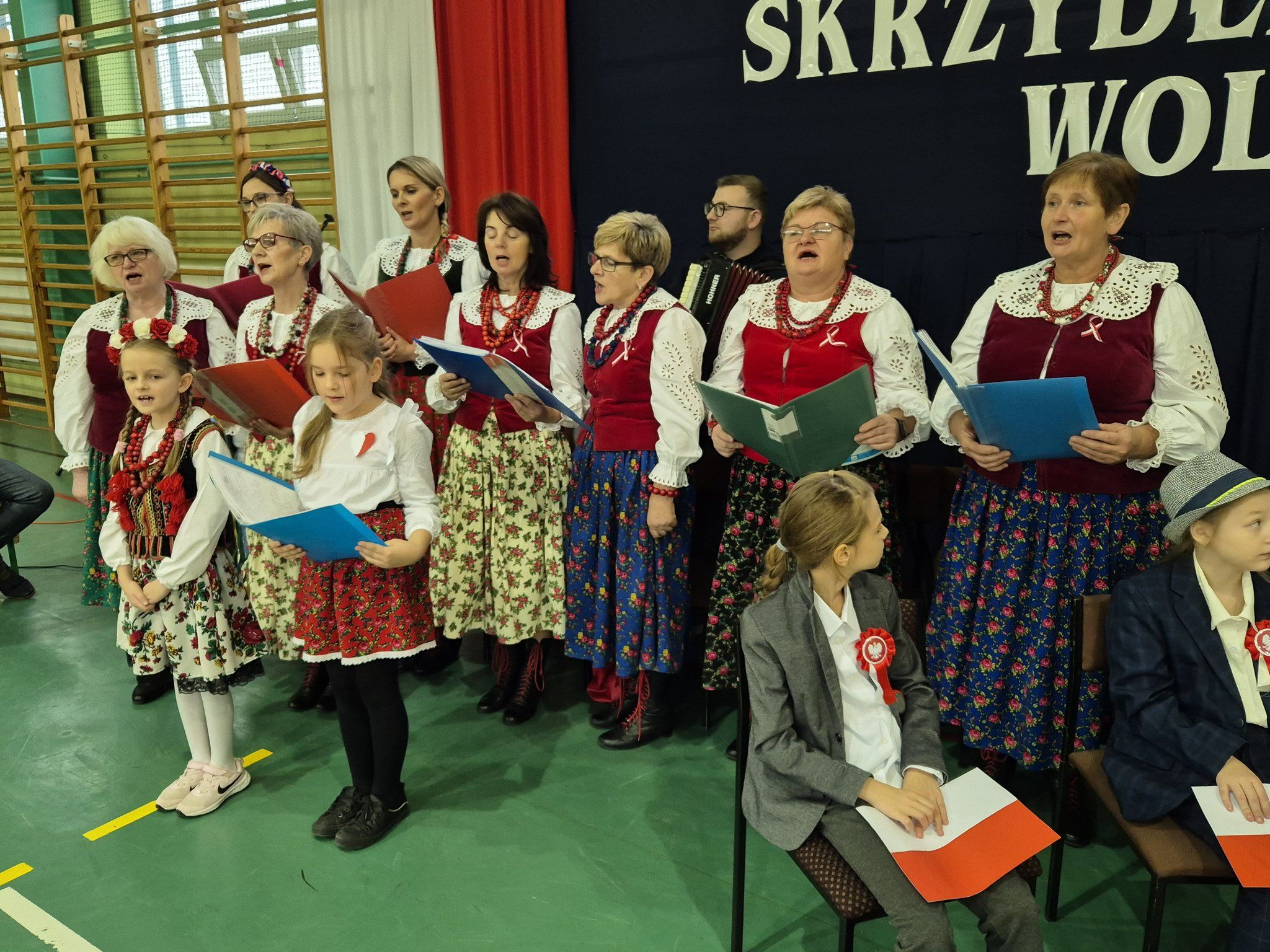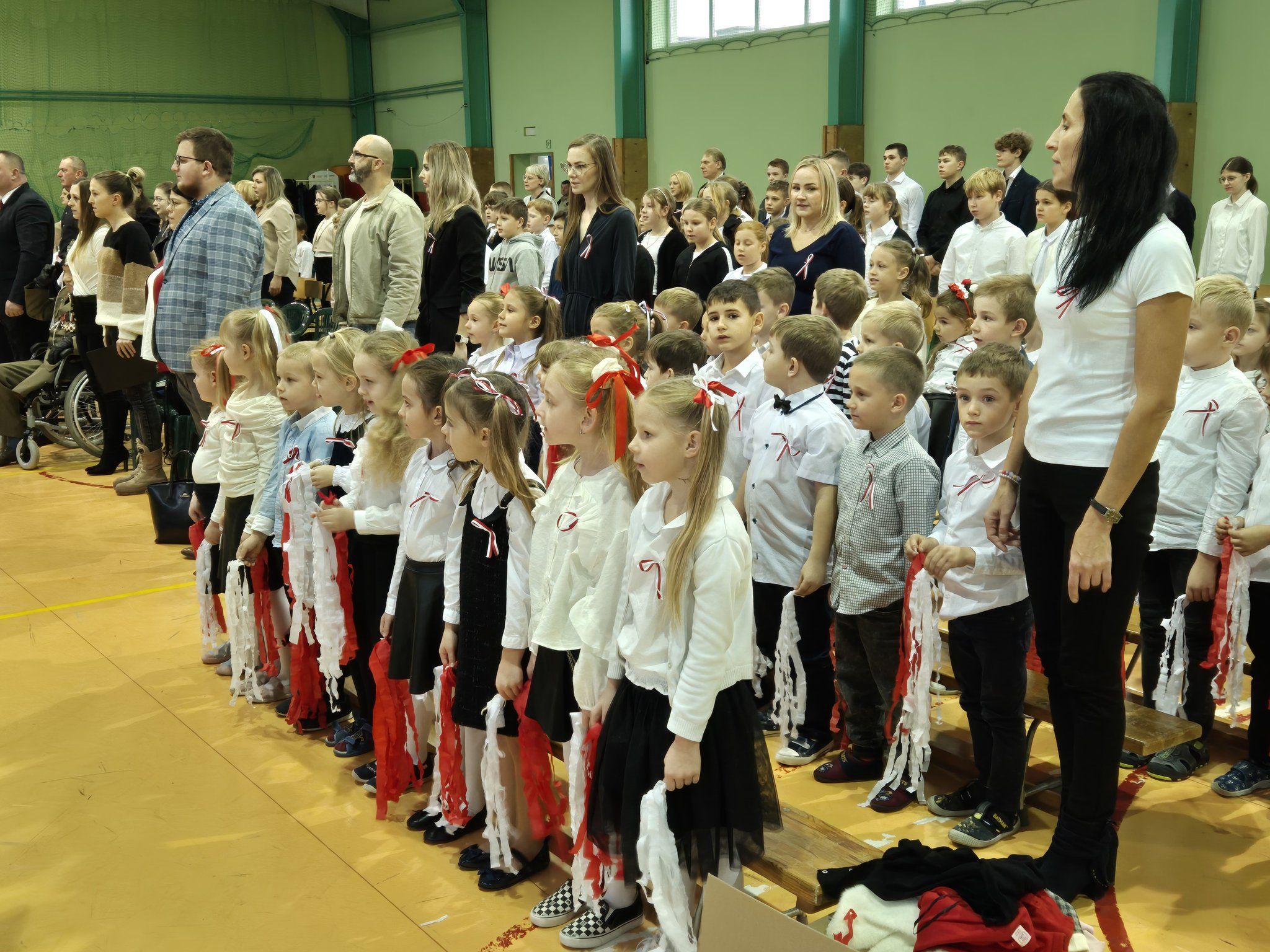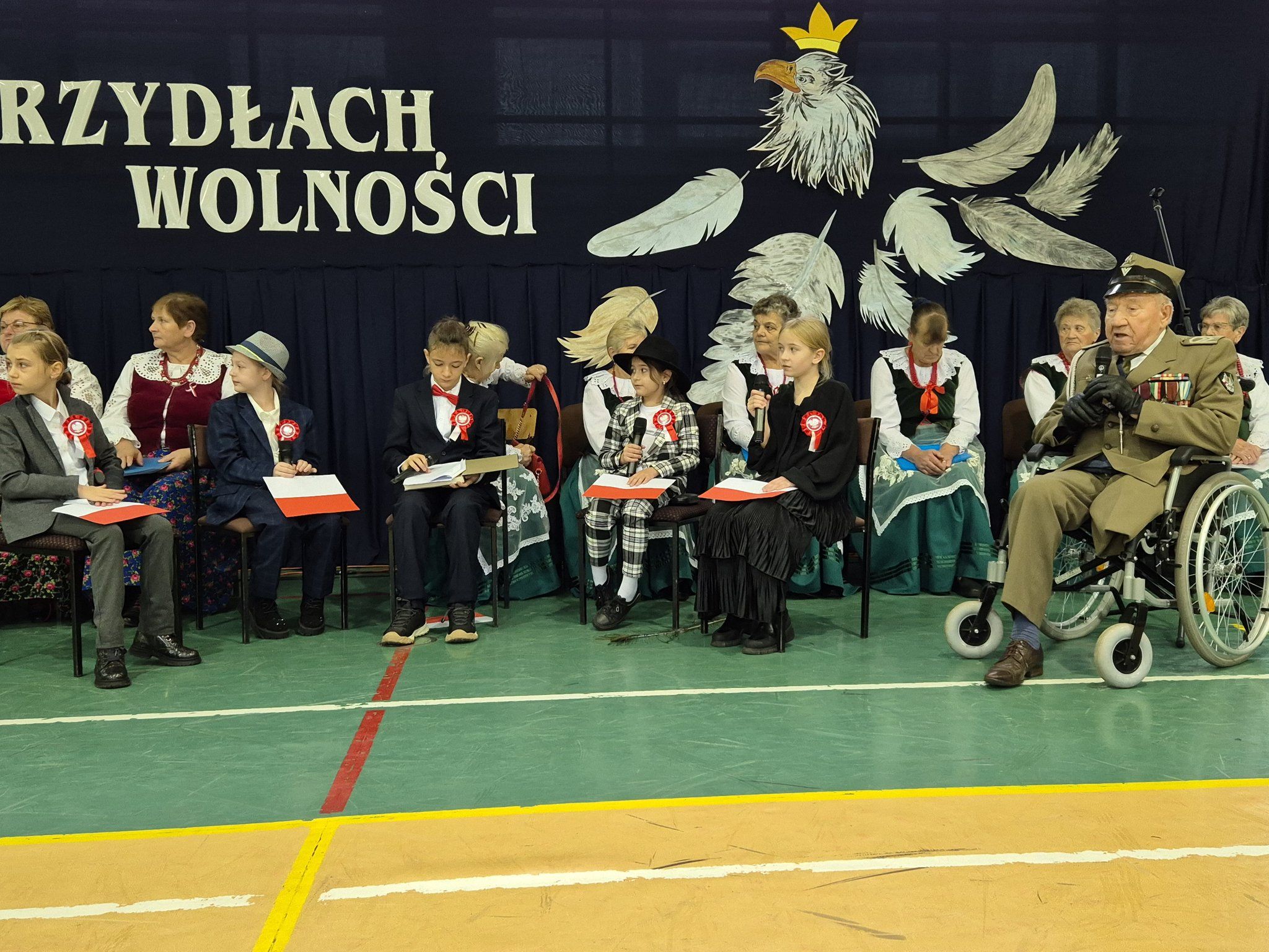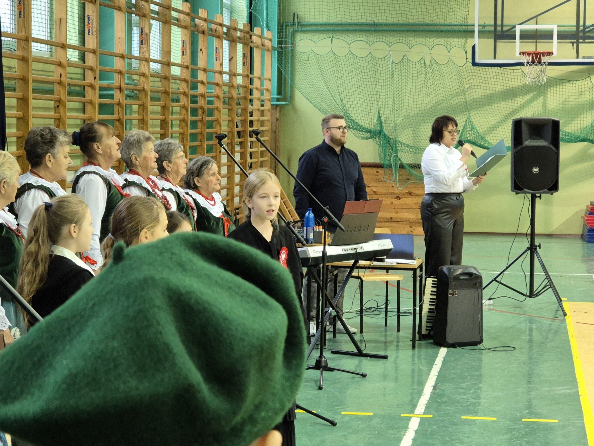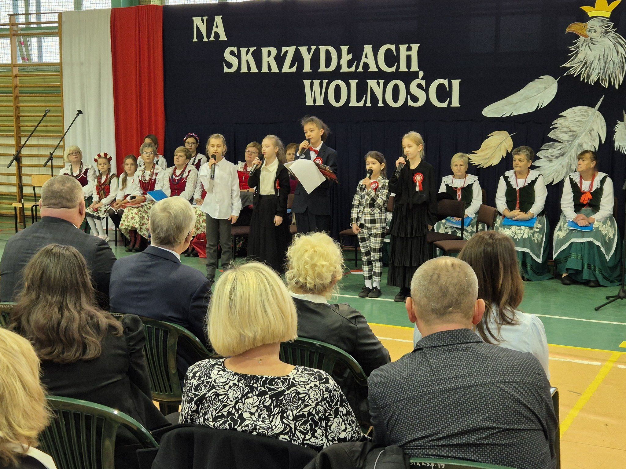 W pięknie udekorowanej, przez nauczycielkę Halinę Jabłońską, hali sportowej szkoły, uczestniczyliśmy w wokalno-muzycznej podróży niepodległościowej i wolnościowej dziejów polskiego narodu. Po raz kolejny pieśń i muzyka połączyła pokolenia gminnej społeczności.