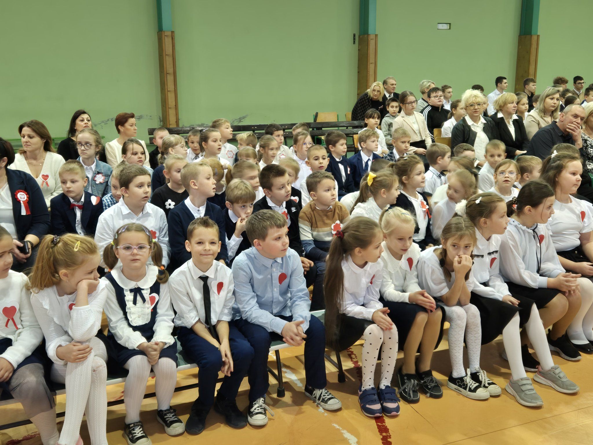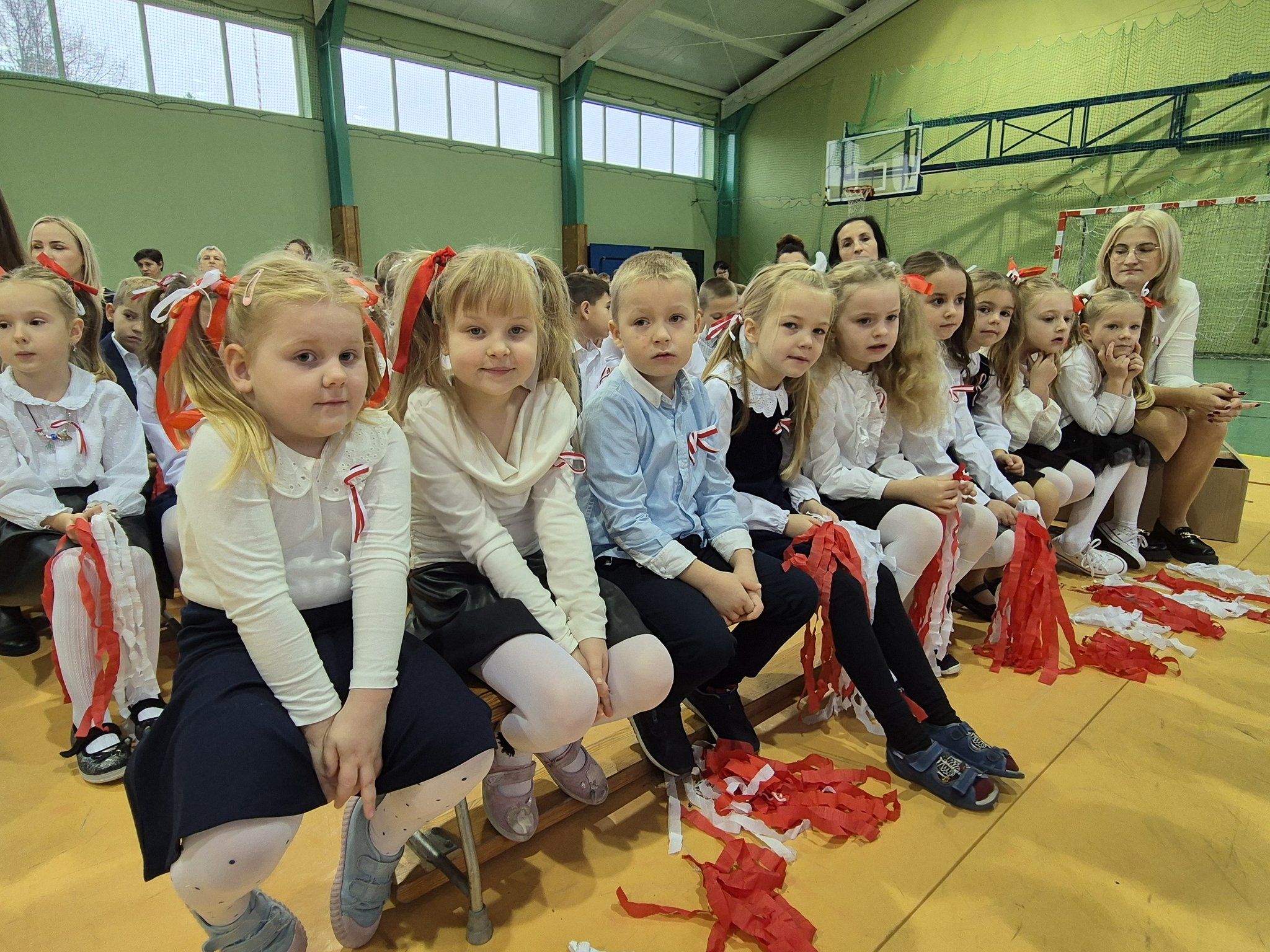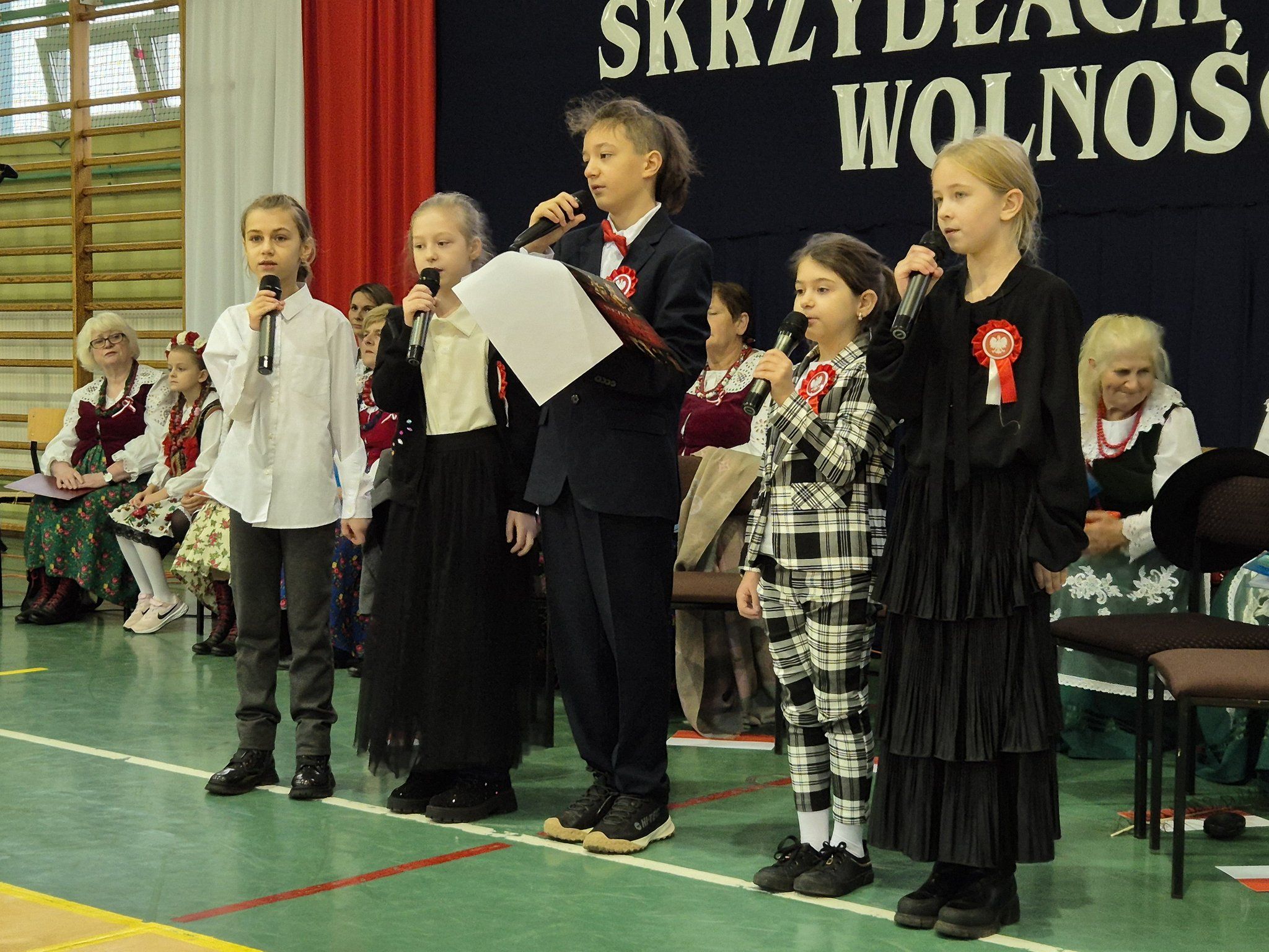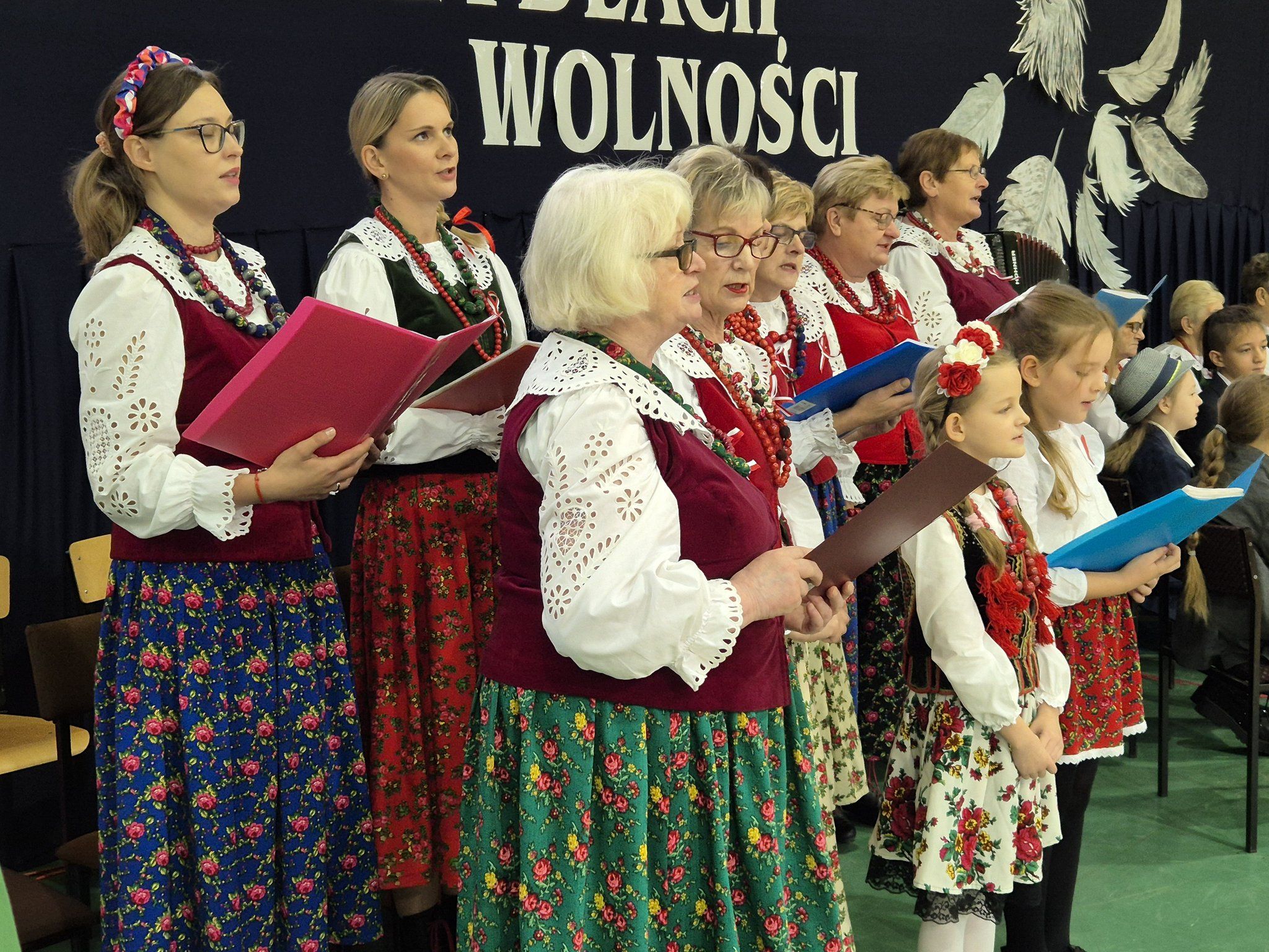 W pięknie udekorowanej, przez nauczycielkę Halinę Jabłońską, hali sportowej szkoły, uczestniczyliśmy w wokalno-muzycznej podróży niepodległościowej i wolnościowej dziejów polskiego narodu. Po raz kolejny pieśń i muzyka połączyła pokolenia gminnej społeczności.