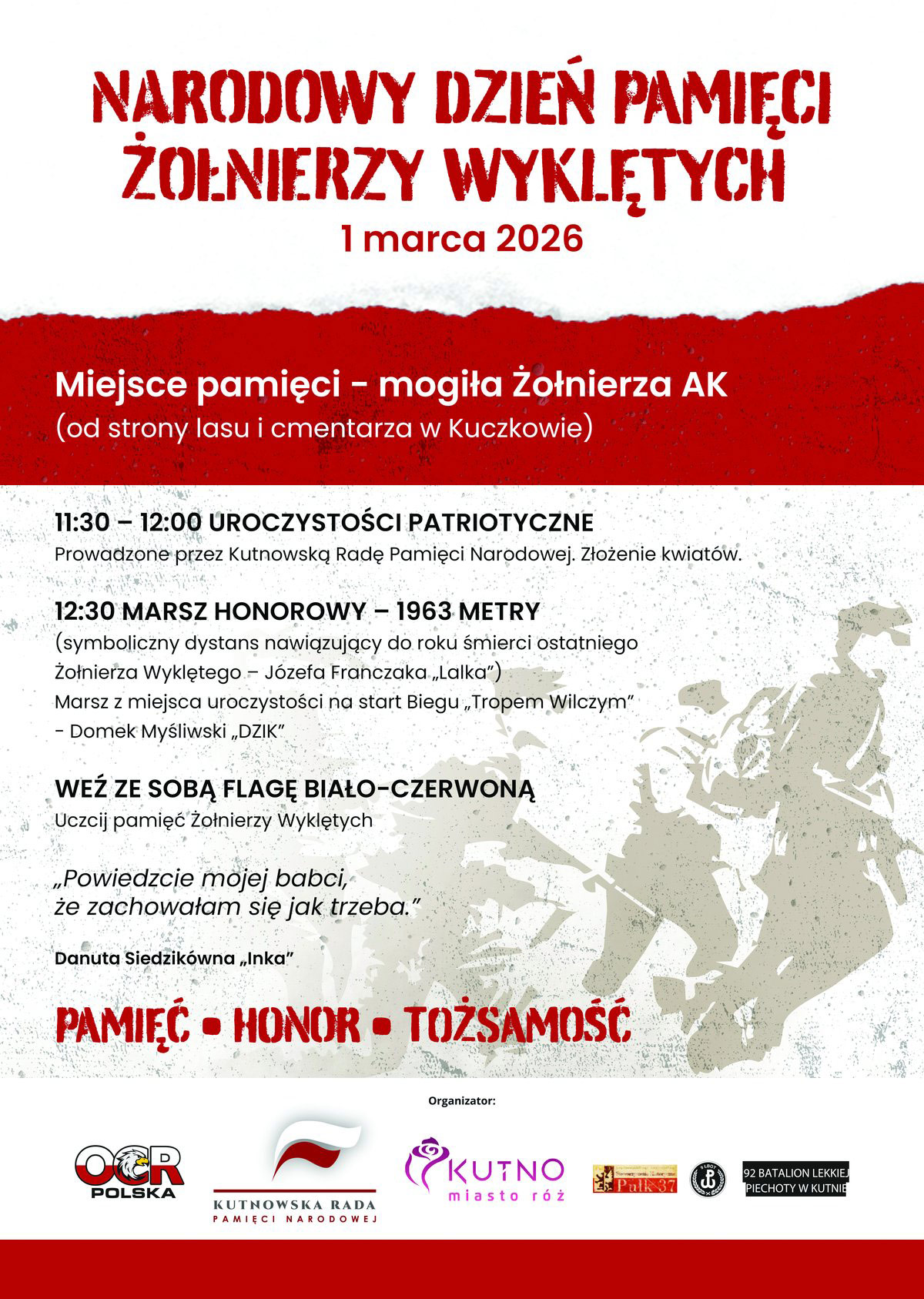 Po zakończeniu oficjalnych uroczystości uczestnicy przeniosą się do lasu raciborowskiego, gdzie zaplanowano dalszą część obchodów w formule patriotyczno-sportowej. O godzinie 12:30 rozpocznie się marsz honorowy na dystansie 1963 metrów. Trasa ma wymiar symboliczny i nawiązuje do roku śmierci Józefa Franczaka „Lalka„, uznawanego za ostatniego Żołnierza Wyklętego, który zginął w 1963 roku.