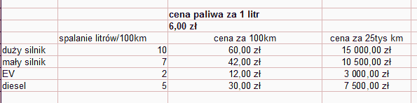 Przy takich uśrednionych założeniach koszty roczne paliwa przy przejechanych 25 tysiącach kilometrów wyglądają tak: