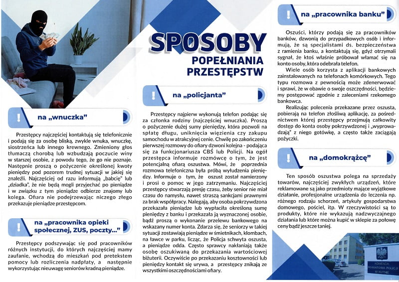 W tym celu powstała specjalna ulotka z wymienionymi i opisanymi rodzajami przestępstw oraz z praktycznymi wskazówkami. Ulotki będą przekazywane starszym osobom przez dzielnicowych podczas codziennej służby, ale także podczas różnego rodzaju spotkań, organizowanych eventów, dni seniora przez magistrat.