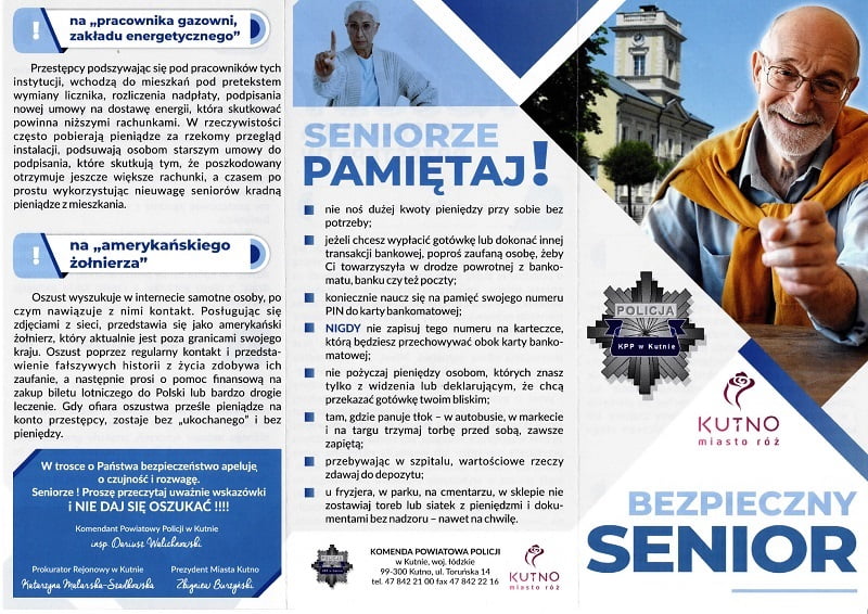 Wychodząc naprzeciw zagrożeniu, Komenda Powiatowa Policji w Kutnie wspólnie z Prezydentem Miasta oraz Prokuraturą Rejonową w Kutnie prowadzi kampanię informacyjno-ostrzegawczą BEZPIECZNY SENIOR,