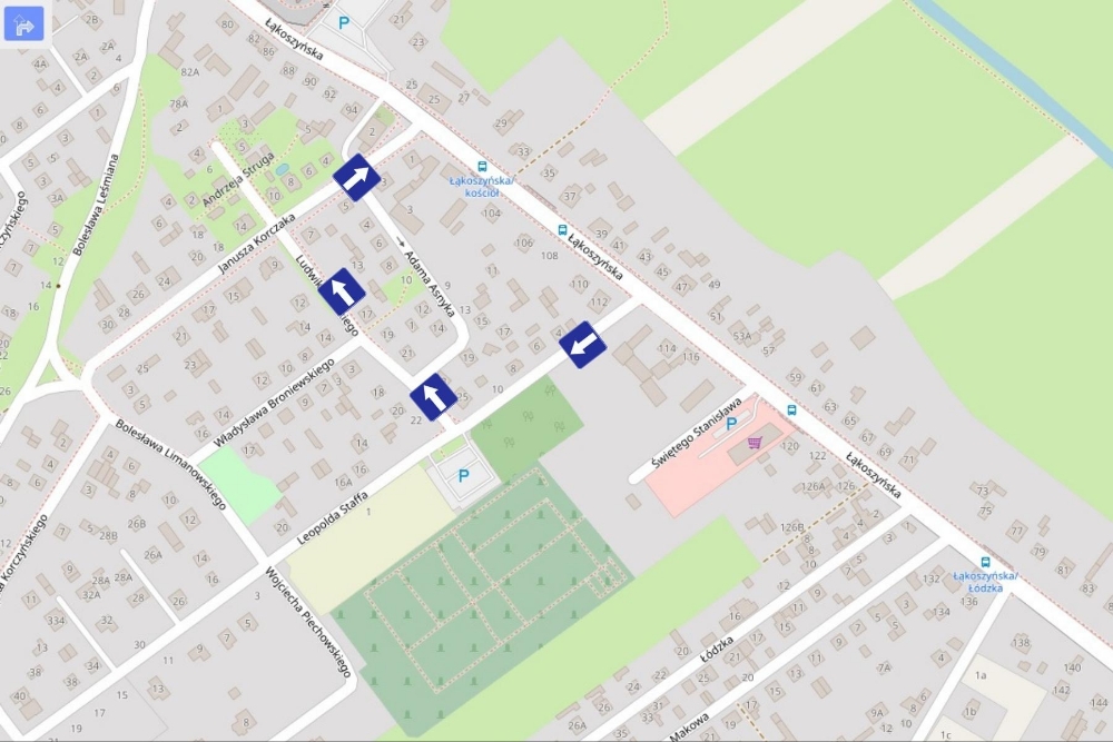 od godz. 06.00 w dniu 31.10.2022 do godz. 18.00 w dniu 02.11.2022 ruch jednokierunkowy kolejno od ul. Łąkoszyńskiej do ul. Staffa, ul. Solskiego, ul. Korczaka i wyjazd w ul. Łąkoszyńską.