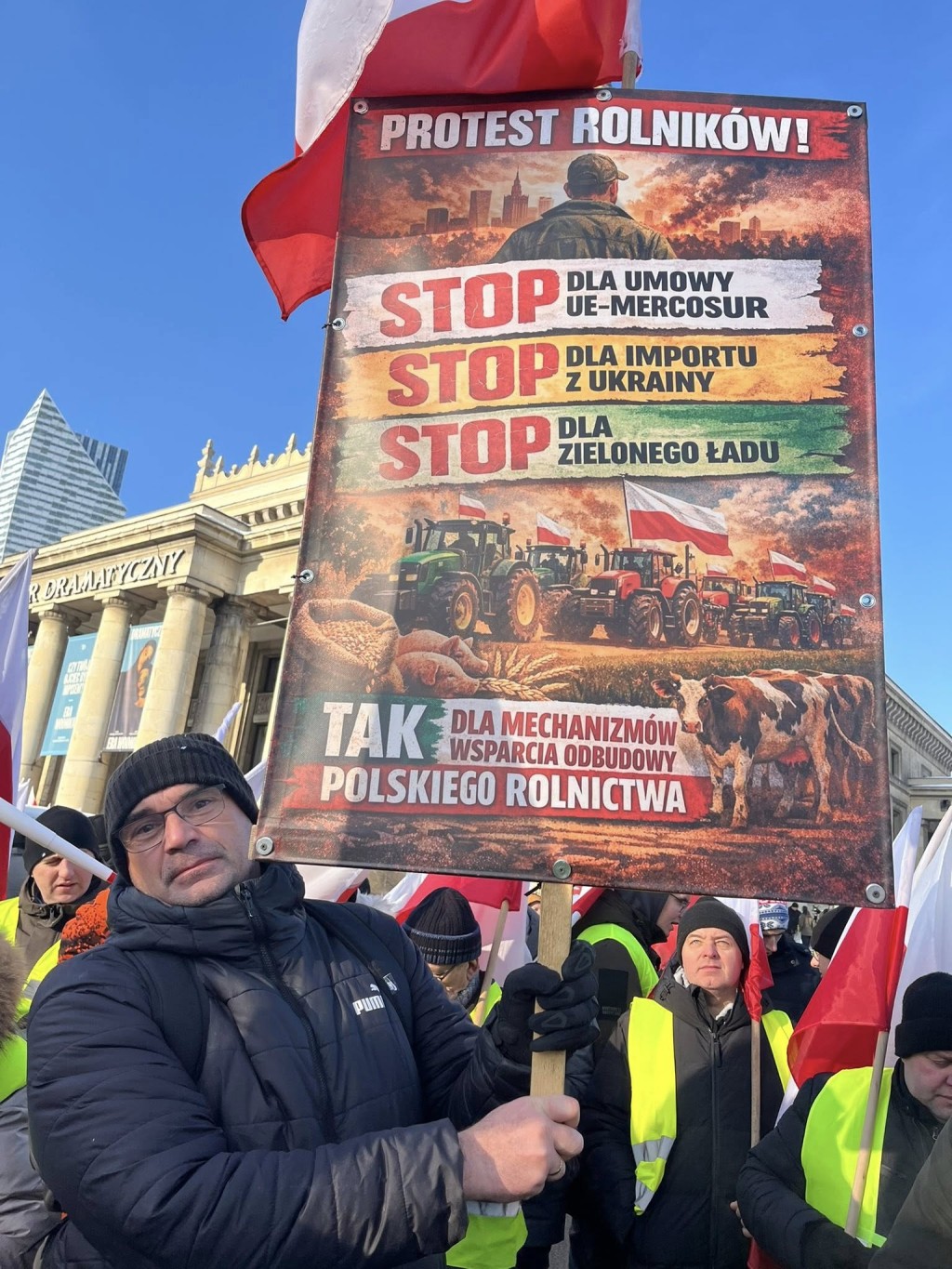 – Jestem dziś na proteście rolników w Warszawie, na Placu Defilad przed Pałacem Kultury i Nauki. Uważam, że umowa UE–Mercosur może osłabić europejskich producentów przez nierówne standardy i nieuczciwą konkurencję. Protestuję, bo bezpieczeństwo żywnościowe i stabilność rynku rolnego są sprawą publiczną. Potrzebujemy rozwiązań, które chronią zarówno handel, jak i naszych rolników. STOP UMOWIE UE–MERCOSUR! – komentuje Tomasz Walczewski, radny Rady Powiatu Kutnowskiego.