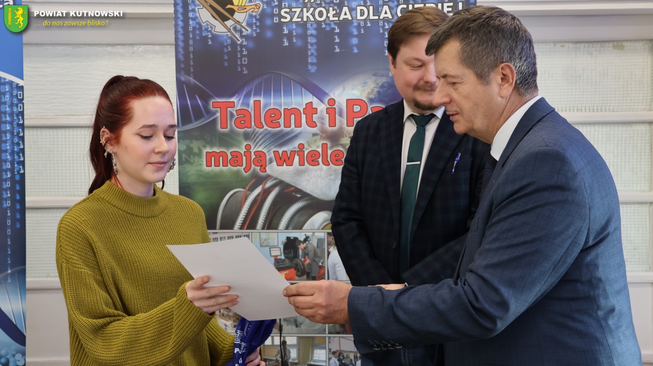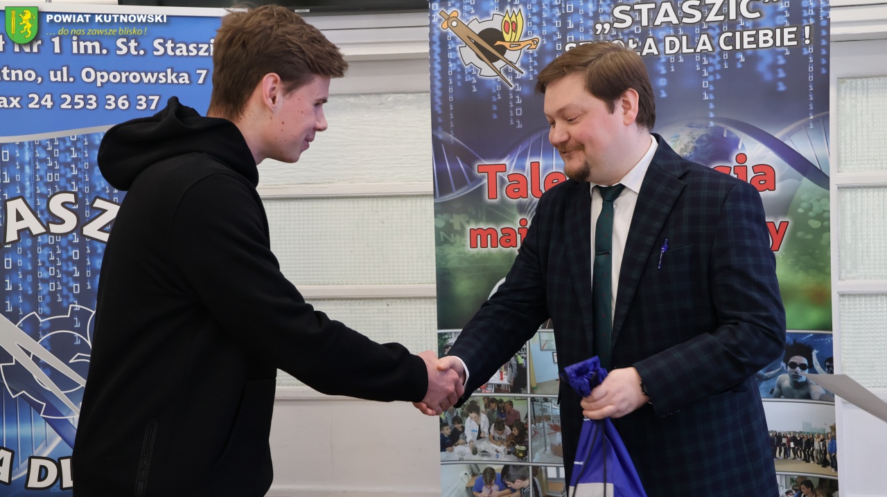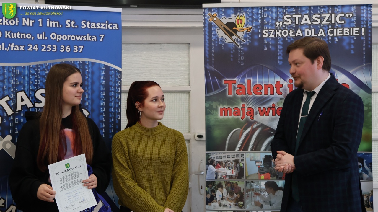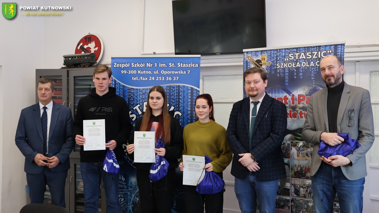21 stycznia br. Daniel Kowalik – Starosta Kutnowski oraz Marek Drabik – Przewodniczący Rady Powiatu Kutnowskiego odwiedzili Zespół Szkół Nr 1 im. Stanisława Staszica w Kutnie. Podczas spotkania podziękowali uczniom, którzy reprezentowali szkołę ze sztandarem podczas Powiatowo-Gminnych Obchodów Narodowego Święta Niepodległości, które odbyły się 9 listopada 2025 r. w Dąbrowicach.