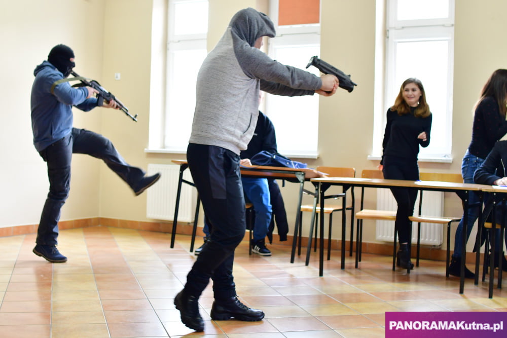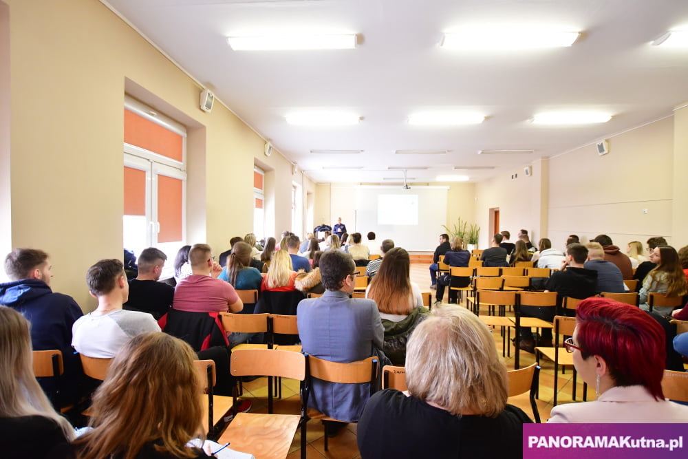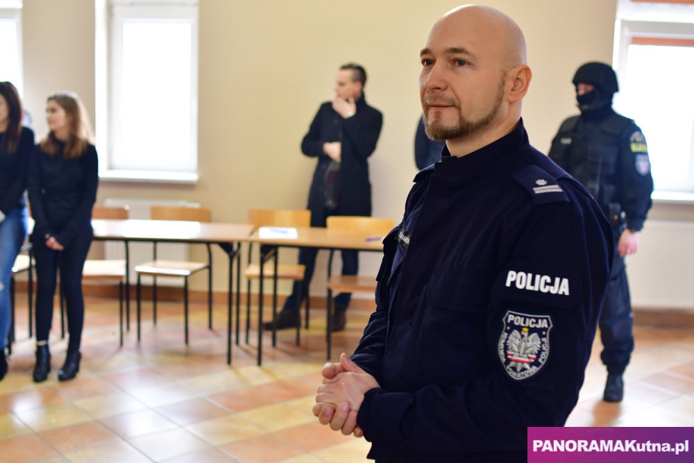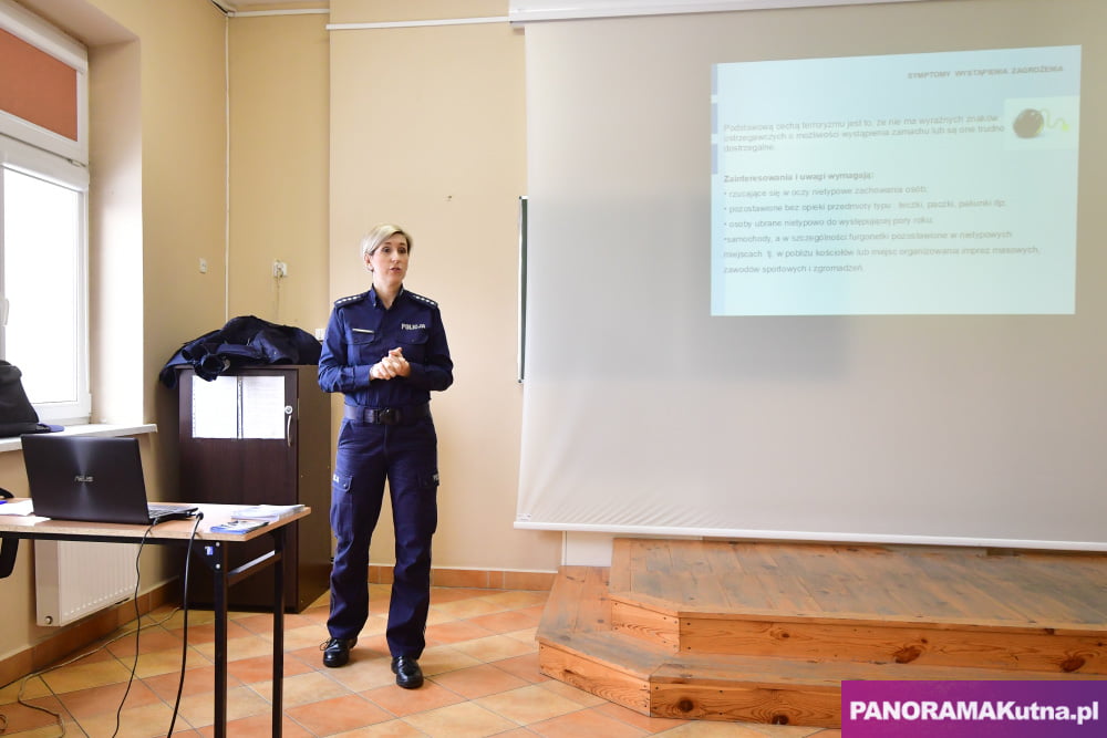 Policjanci z kutnowskiej komendy poprowadzili dziś wykład na temat zagrożenia terrorystycznego w placówkach edukacyjnych. Edyta Machnik i Aneta Kowalska najpierw opowiedziały o pracy funkcjonariuszy, a następnie przybliżyły zagadnienia związane z atakami terrorystycznymi i tym, jak zachować się w takiej sytuacji. Obecny był również komendant KPP Kutno Krzysztof Szymański.