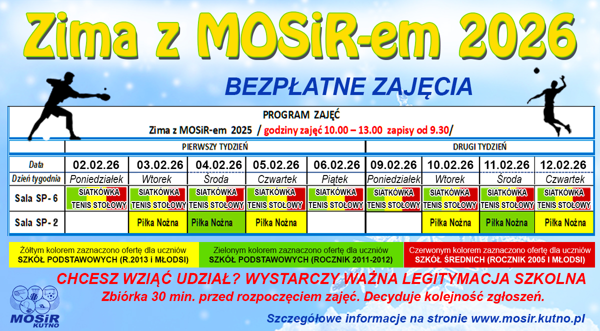 „Zima z MOSiR-em” to nie tylko sport, to przede wszystkim bezpieczna alternatywa dla nudy. To czas na nawiązanie nowych znajomości, poprawienie kondycji i przeżycie sportowych emocji w duchu fair play. Organizatorzy zapewniają cały niezbędny sprzęt sportowy – Ty przynieś tylko energię i uśmiech!
